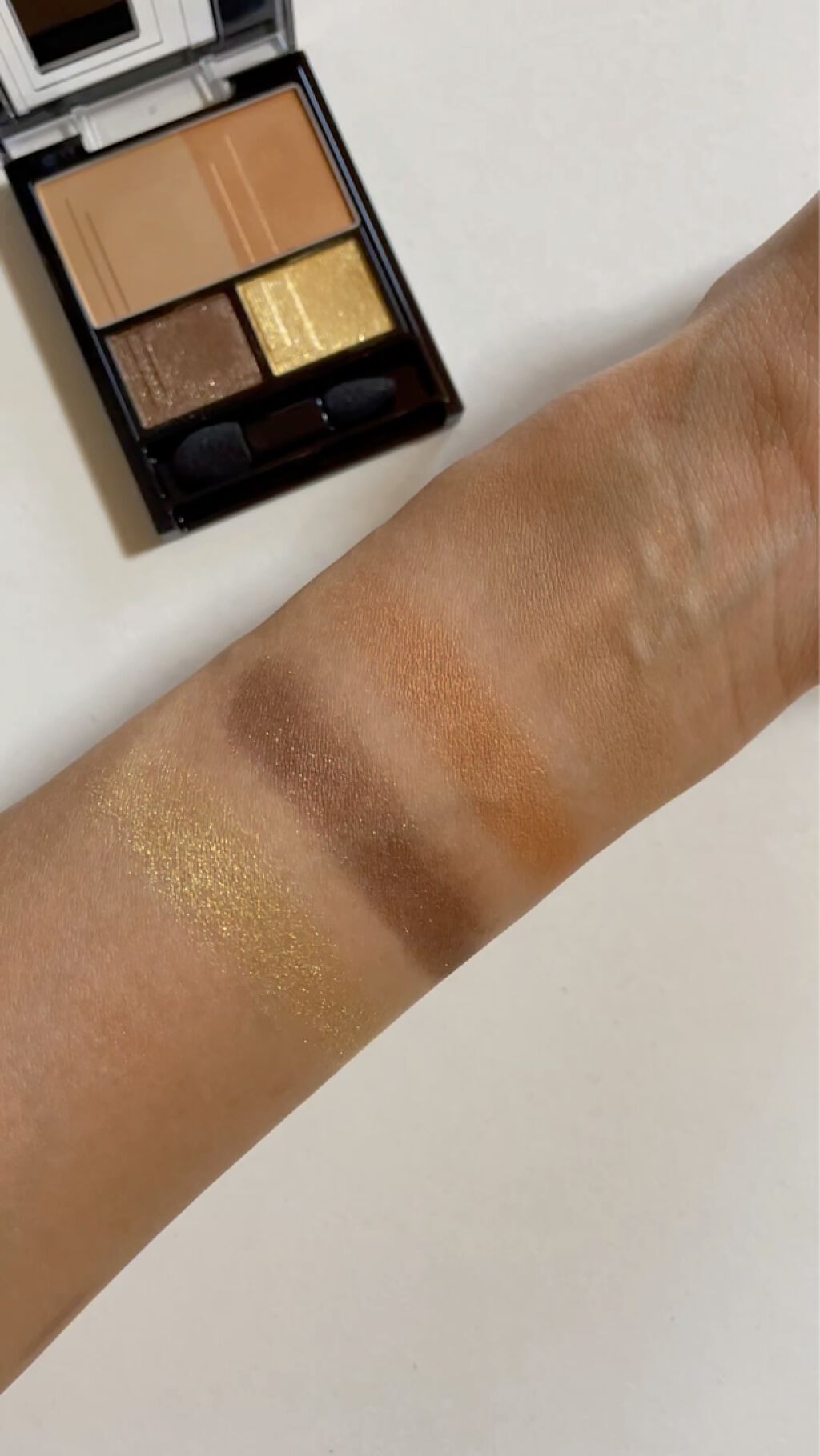 ほんとに密着パウダーって感じ!! ツヤツヤでラメもあってかわいい!! ラメのアイシャドウは粉飛びすると 目の下までキラキラしてしまうから密着力大事!! こういう小さいパレットって 相性のいい色が集まっていて楽ちん それでプチプラなので買いやすい!! プチプラのいいところは失敗してもいいやくらいで 気軽に買えるところ!! 挑戦したいカラーとかにもおすすめ!