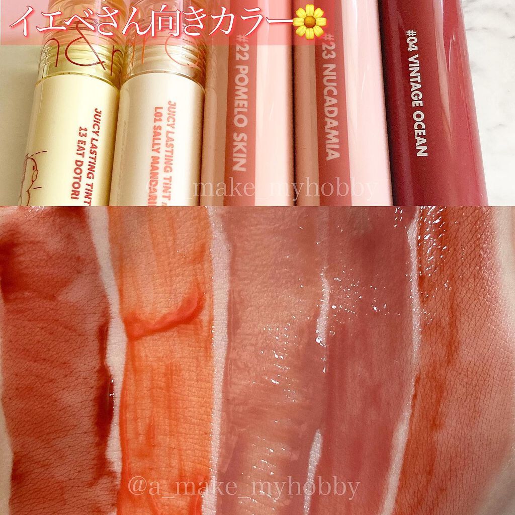 rom&nd ジューシーラスティングティント税込1,320円どれも使いやすいヌーディーカラー🤍⚠️今は商品がリニューアルして、カラー番号が変わってしまっています😓店舗によっては、まだリニューアル前の商品も置いているのですが、色味の参考にでもな...