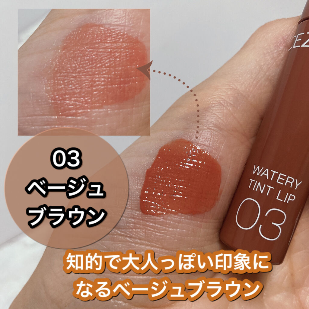 - ツヤ×色×潤いをキープする、セザンヌの新濡れツヤリップ みずみずしい濡れツヤ感ある仕上がりで、発色とツヤが長続きするティントリップです。ティントの発色を透明のベールで覆うリップコートのような処方で、ツヤ感と色をキープします。さらに、唇表面のべたつきは少なく、しっとり潤うオイルinウォーター処方を採用しています。