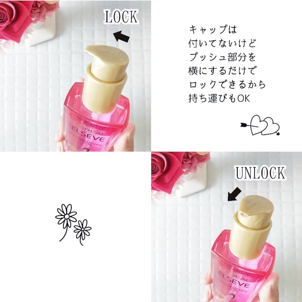 フレンチローズオイル(カニナバラ花エキス:保湿成分)が髪に潤いとツヤを与えて、魅惑的なローズフレグランスの香りで包み込んでフェミニンな印象にしてくれます🥀✨ 髪に伸ばすとパサパサに乾燥して広がってた髪が毛先までしっとりと潤い、ツヤが出ました☺️ プッシュ部分を回すだけでロックができるので蓋をする手間がないし、持ち運びのときにも安心です◎