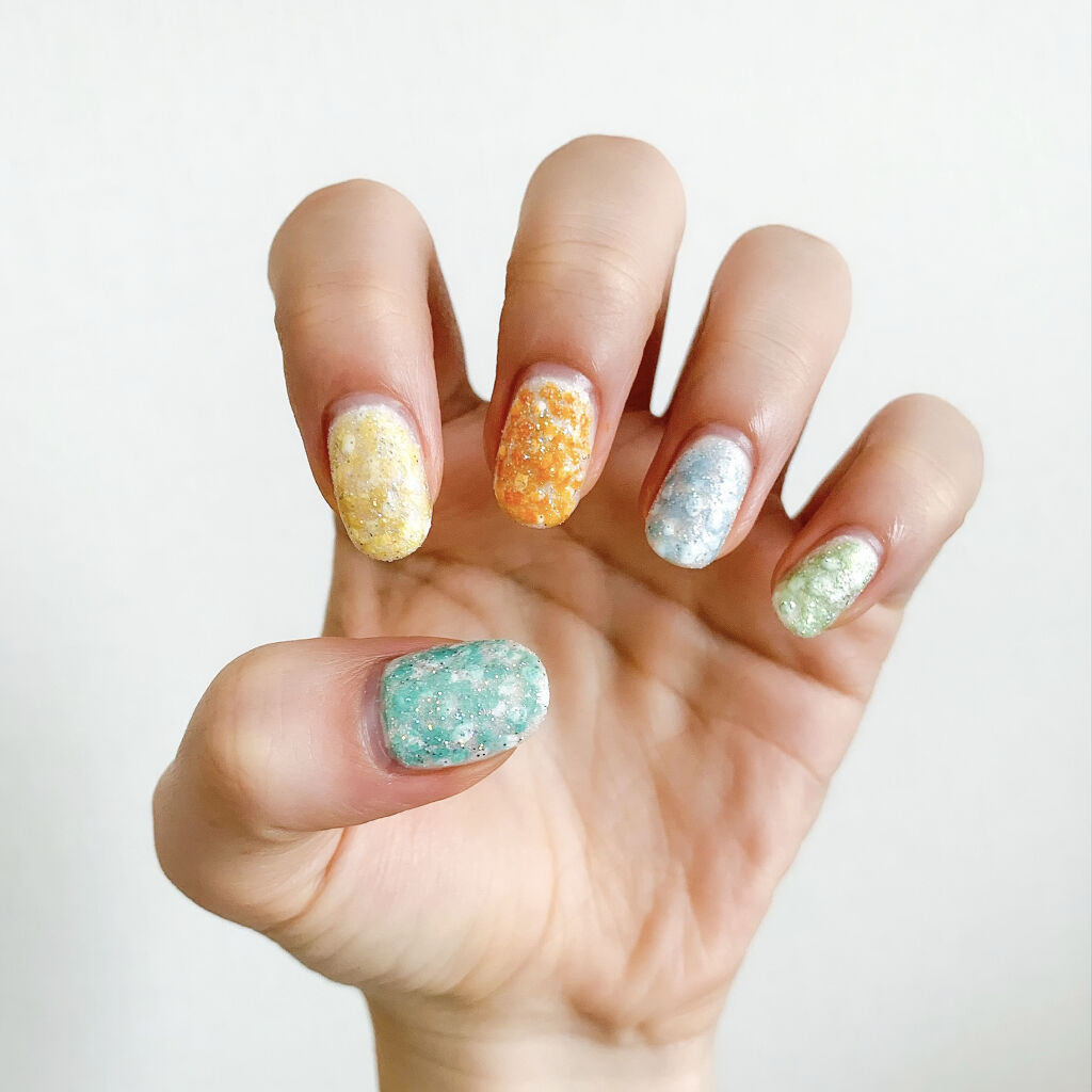今回は色を混ぜたりぼかしたりせず、ハケを縦にトントンするだけでできます! 濃いピンクをトントンするときはハケに液がほとんどついてない状態でやってください! 表面がでこぼこした方が桃の質感がリアルに表現できていいです◎ 濃いピンクをトントンする範囲はどんどん狭めていくとグラデーションにできます🍑 トップコートでツヤを出しても、マットにしても可愛いです❀