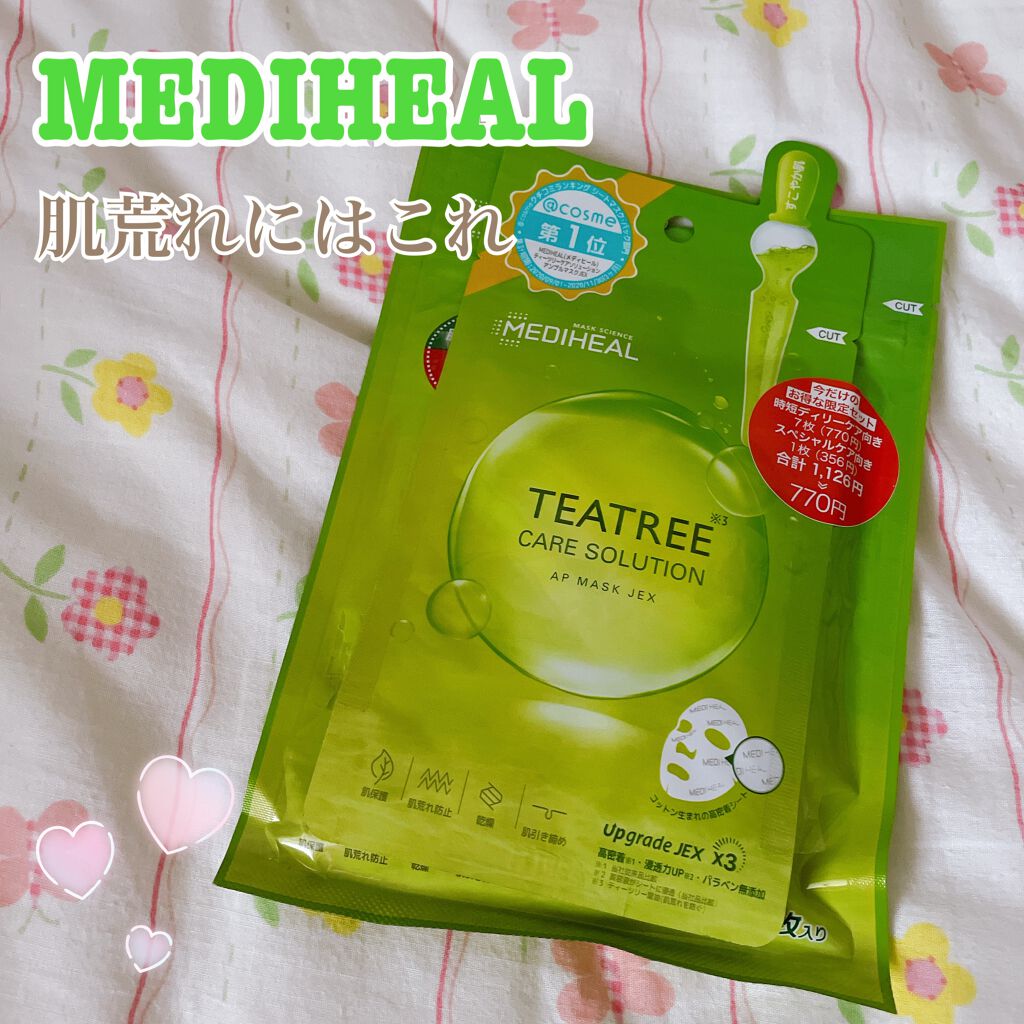 MEDIHEAL3ミニッツマスク:カーマイドwithティーツリー¥770生理や花粉が過ぎても肌の調子が上向かないな〜と思って購入。メディヒールのティーツリーはちょくちょく使っていたので、メディヒールの緑っぽいパッケージなら…と思って手を伸ばし...