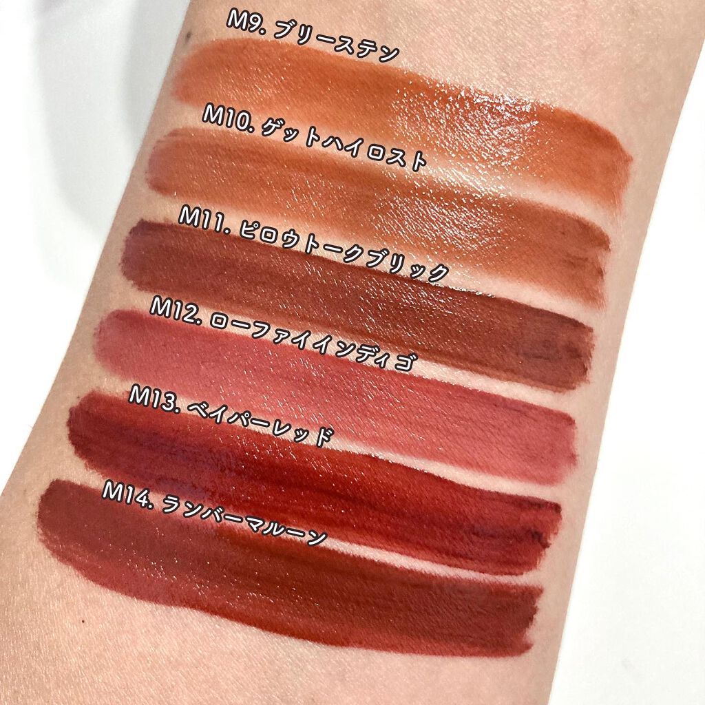 - <M11 ピロウトークブリック> ジメチコン、(ジメチコン/ビニルジメチコン)クロスポリマー、水、グリセリン、セチルPEG/PPG-10/1ジメチコン、トリイソステアリン酸ポリグリセリル-2、ペンチレングリコール、リンゴ酸ジイソステアリル、メチルトリメチコン、マイカ、シリカ、シクロペンタシロキサン、(アクリル酸ブチル/アクリル酸ヒドロキシプロピルジメチコン)コポリマー、イソドデカン、フェノキシエタノール、トリメチルシロキシケイ酸、(アクリル酸グリセリル/アクリル酸)コポリマー、ポリプロピルシルセスキオキサン、カプリリルグリコール、1,2-ヘキサンジオール、プロパンジオール、香料、エチルヘキシルグリセリン、ジメチルシリル化シリカ、水酸化Al、ダイウイキョウ果実エキス、メチコン、ワサビノキ種子油、アルガニアスピノサ核油、ヤシ油、シア脂、ハチミツエキス、BG、酸化チタン、酸化鉄、赤202、赤227、黄5、青1 <M12 ローファイインディゴ> ジメチコン、(ジメチコン/ビニルジメチコン)クロスポリマー、水、グリセリン、トリイソステアリン酸ポリグリセリル-2、セチルPEG/PPG-10/1ジメチコン、ペンチレングリコール、シクロペンタシロキサン、メチルトリメチコン、(アクリル酸ブチル/アクリル酸ヒドロキシプロピルジメチコン)コポリマー、イソドデカン、リンゴ酸ジイソステアリル、フェノキシエタノール、トリメチルシロキシケイ酸、(アクリル酸グリセリル/アクリル酸)コポリマー、マイカ、シリカ、ポリプロピルシルセスキオキサン、カプリリルグリコール、1,2-ヘキサンジオール、水酸化Al、プロパンジオール、香料、エチルヘキシルグリセリン、ジメチルシリル化シリカ、ダイウイキョウ果実エキス、メチコン、ワサビノキ種子油、アルガニアスピノサ核油、ヤシ油、シア脂、ハチミツエキス、BG、酸化チタン、酸化鉄、赤202、赤227、黄5、青1 <M13 ベイパーレッド> ジメチコン、(ジメチコン/ビニルジメチコン)クロスポリマー、水、グリセリン、トリイソステアリン酸ポリグリセリル-2、セチルPEG/PPG-10/1ジメチコン、ペンチレングリコール、メチルトリメチコン、リンゴ酸ジイソステアリル、(アクリル酸ブチル/アクリル酸ヒドロキシプロピルジメチコン)コポリマー、イソドデカン、フェノキシエタノール、トリメチルシロキシケイ酸、(アクリル酸グリセリル/アクリル酸)コポリマー、マイカ、シリカ、ポリプロピルシルセスキオキサン、カプリリルグリコール、シクロペンタシロキサン、1,2-ヘキサンジオール、プロパンジオール、香料、エチルヘキシルグリセリン、ジメチルシリル化シリカ、ダイウイキョウ果実エキス、メチコン、アルガニアスピノサ核油、ヤシ油、シア脂、ワサビノキ種子油、ハチミツエキス、BG、酸化鉄、赤104(1)、赤202、赤227、黄4、黄5、青1 <M14 ランバーマルーン> ジメチコン、(ジメチコン/ビニルジメチコン)クロスポリマー、水、トリイソステアリン酸ポリグリセリル-2、グリセリン、セチルPEG/PPG-10/1ジメチコン、リンゴ酸ジイソステアリル、ペンチレングリコール、シクロペンタシロキサン、メチルトリメチコン、(アクリル酸ブチル/アクリル酸ヒドロキシプロピルジメチコン)コポリマー、イソドデカン、フェノキシエタノール、トリメチルシロキシケイ酸、(アクリル酸グリセリル/アクリル酸)コポリマー、マイカ、シリカ、ポリプロピルシルセスキオキサン、カプリリルグリコール、1,2-ヘキサンジオール、プロパンジオール、香料、エチルヘキシルグリセリン、ジメチルシリル化シリカ、ダイウイキョウ果実エキス、メチコン、アルガニアスピノサ核油、ヤシ油、シア脂、ワサビノキ種子油、ハチミツエキス、BG、酸化鉄、赤202、赤227、黄5、青1 <M15 ウェアリーシロップ> ジメチコン、(ジメチコン/ビニルジメチコン)クロスポリマー、水、グリセリン、セチルPEG/PPG-10/1ジメチコン、シクロペンタシロキサン、トリイソステアリン酸ポリグリセリル-2、ペンチレングリコール、メチルトリメチコン、リンゴ酸ジイソステアリル、(アクリル酸ブチル/アクリル酸ヒドロキシプロピルジメチコン)コポリマー、イソドデカン、フェノキシエタノール、トリメチルシロキシケイ酸、(アクリル酸グリセリル/アクリル酸)コポリマー、マイカ、シリカ、ポリプロピルシルセスキオキサン、カプリリルグリコール、1,2-ヘキサンジオール、プロパンジオール、香料、エチルヘキシルグリセリン、水酸化Al、ジメチルシリル化シリカ、ダイウイキョウ果実エキスメチコン、ヤシ油、シア脂、ワサビノキ種子油、アルガニアスピノサ核油、ハチミツエキス、BG、酸化チタン、酸化鉄、赤202、赤227、黄5、青1 <M16 デイズシナモン> ジメチコン、(ジメチコン/ビニルジメチコン)クロスポリマー、水、グリセリン、セチルPEG/PPG-10/1ジメチコン、トリイソステアリン酸ポリグリセリル-2、シクロペンタシロキサン、ペンチレングリコール、メチルトリメチコン、リンゴ酸ジイソステアリル、マイカ、シリカ、(アクリル酸ブ