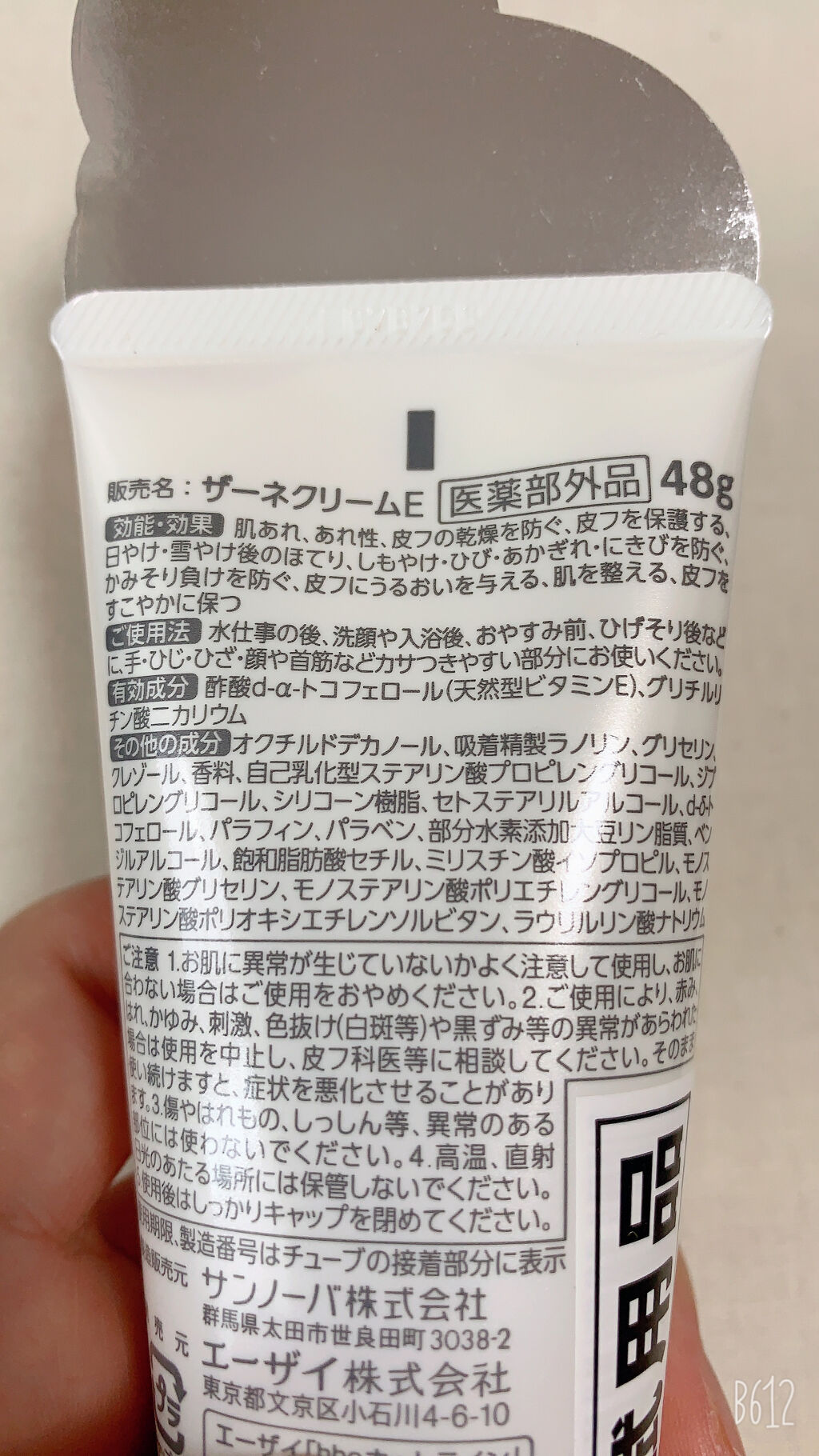 - 【医薬部外品】 おやすみ前の“ビタミンE塗り”で顔も手指もしっとりなめらかに 「ザーネクリーム」で「めぐらせ保湿」。天然型ビタミンEのチカラで肌の血行を促進し、必要な栄養素を届け、ターンオーバーを整えることで、肌をすこやかに保ちます。 しっとりが続くのにベタつかないテクスチャー。肌の刺激にも配慮 製薬会社として外用剤や皮膚生理機能の研究で培ってきた知見をベースに、肌への効果とテクスチャーの両立を追求。 クリーム基剤のノウハウを活かした処方技術により、しっとりが続くのにベタつきません。 塗ってすぐPC・スマートフォン操作や家事もOKです。 また、人の肌の構成成分や、体温で融けやすい融点をもつ成分など、肌との親和性の高い成分を配合し、肌の刺激にも配慮した処方設計です。 香りもマイルドなので、シーンを選ばずお使いいただけます。 有効成分 :天然型ビタミンE、グリチルリチン酸二カリウム(消炎成分) 効能・効果 :肌あれ、あれ性、皮フの乾燥を防ぐ、皮フを保護する、日やけ・雪やけ後のほてり、しもやけ・ひび・ あかぎれ・にきびを防ぐ、かみそり負けを防ぐ、皮フにうるおいを与える、肌を整える、皮フをすこやかに保つ