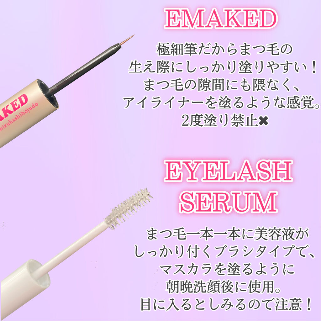 #水橋保寿堂製薬【#EMAKED#エマーキット】まつ毛の生え替わりに着目したまつ毛美容液1日1回、寝る前にアイライナーみたいにまつ毛の根元にぬるだけ細い筆で塗りやすいし、液垂れしてこないから使いやすいまつ毛がツヤッとするし、イキイキした感じに...