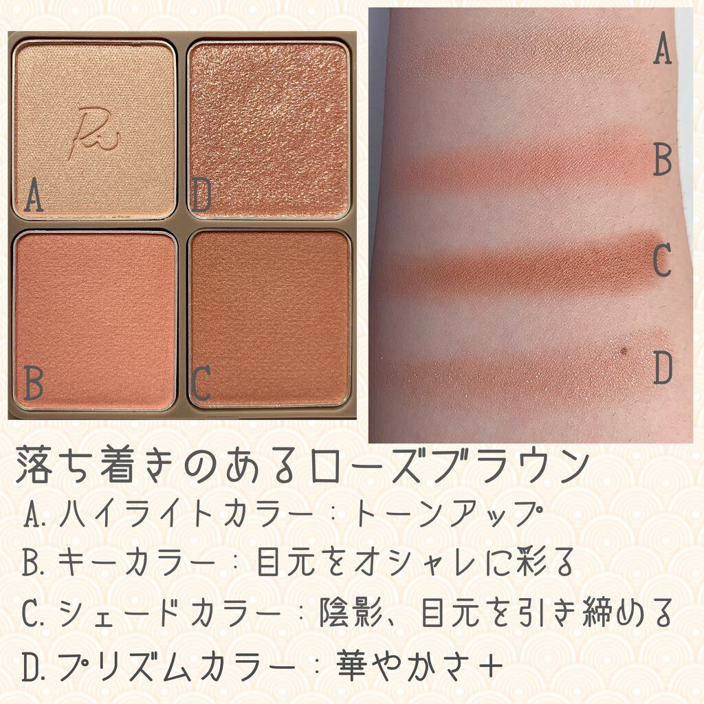 - 2021年3月15日(月)予約販売開始 色×光×質感を1つに詰め込み、毎日のアイメイクのバリエー ションを膨らませる4色のアイシャドウパレット。 ・発色・質感を調整しやすいチップ&ブラシ ふんわり仕上げたいときはブラシ しっかり発色させたいときはチップを その日の気分に合わせたアイメイクが楽しめる ・ 毎日のメイクが楽しくなる4つのカラー ・こだわりの3つの質感 シマー・プリズム・マットのテクスチャー それぞれのカラーがしっかり色づきピタッと密着 ●保湿美容液成分:セラミド・ヒアルロン酸・モモ葉エキス 配合。 ●ミラー・チップ&ブラシ付き。