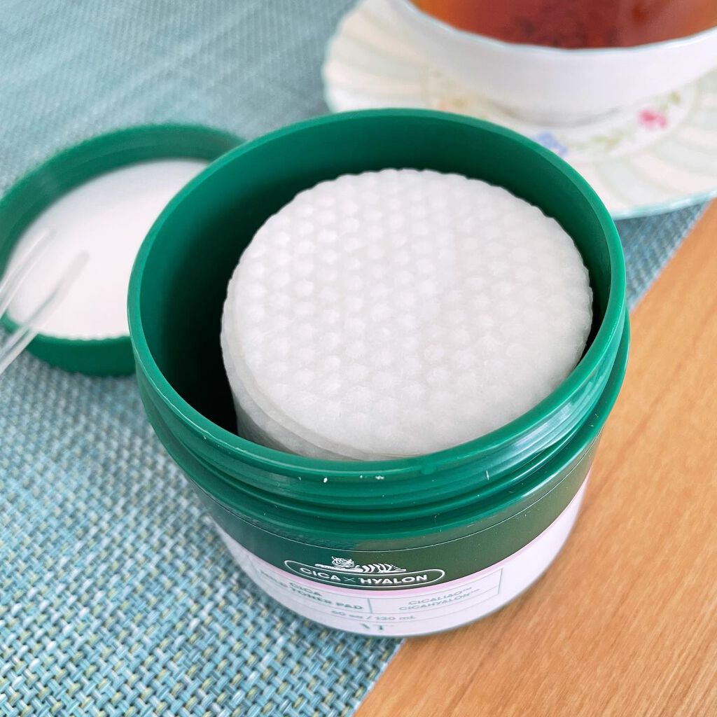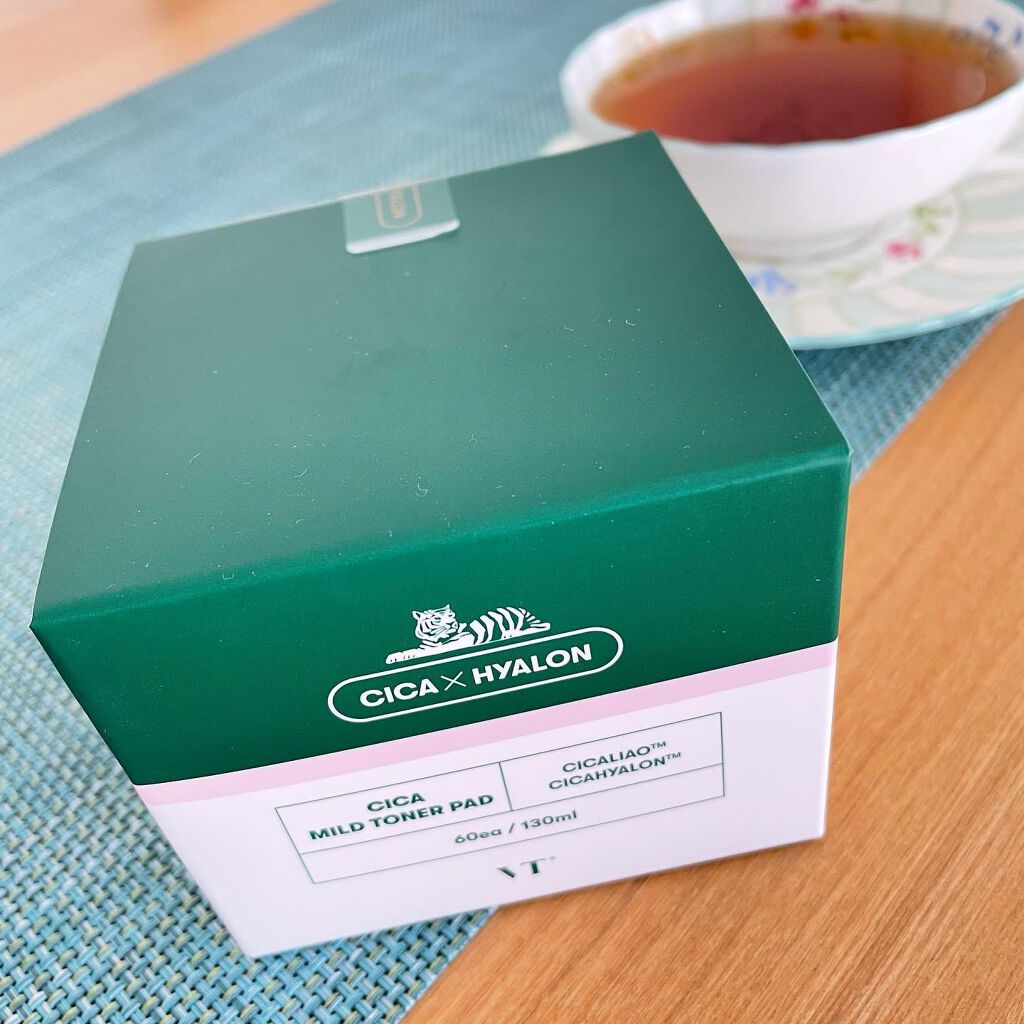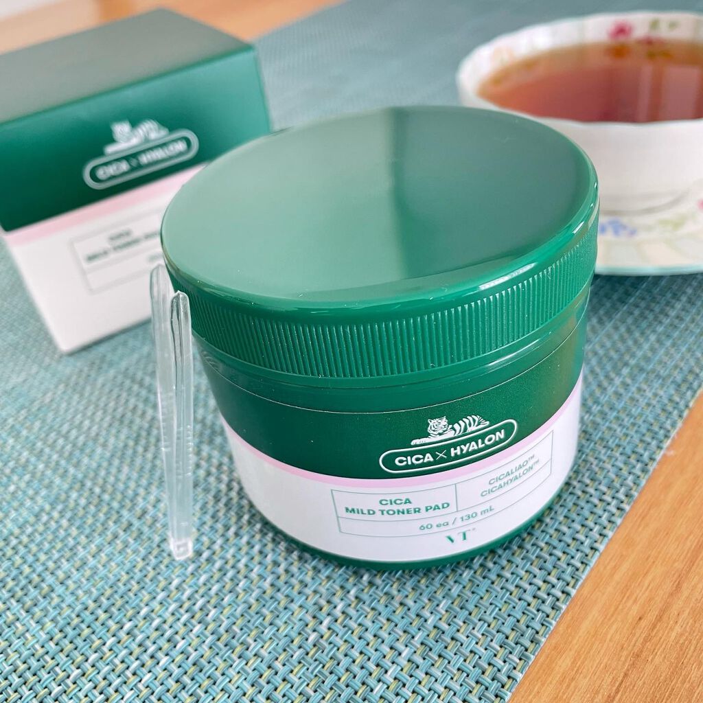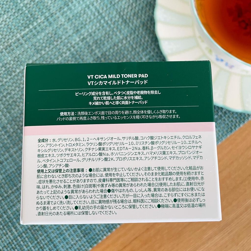 でこぼこのエンボス面で不必要な角質や毛穴汚れなどを拭き取れるトナーパッド! 朝ぬるま湯で顔を洗ってから、メイク前にトナーパットで拭き取るのが大好き🌟 夜のケアだと、赤みやポツポツニキビが気になる部分にパットを抑えて部分用パックとして使うのも好き!! VTのCICAはとにかく肌荒れが気になる時 (赤みやニキビ)に使用するのがおすすめ🌿💚