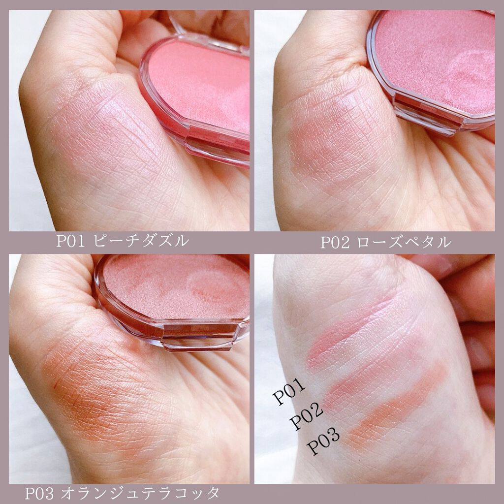 ・潤いたっぷりで質感はサラサラ ・頬にのせた瞬間すっと溶け込み、肌が自然と紅潮したような仕上がりに パール高配合で濡れたようなツヤ肌に (光に当たるとパールの輝きが美しい。発色はおだやか) クリア発色でリップにも使える (しっかり発色するのでスポンジなどで薄く重ねるのがおすすめ) 通常のクリームチーク。頬の内側からにじみ出るように発色 (こちらもしっかりめの発色。色が絶妙でいろんなメイクが楽しめます) CL01 クリアレッドハートは底見えする程使いました😊 最近発売された限定色のパールタイプはパールたっぷりでハイライトのようにも使えます😳 通常タイプで良く使う、21 タンジェリンティーは肌に近いナチュラルなコーラルベージュでどんなメイクにも合わせやすい万能なカラーです☺️