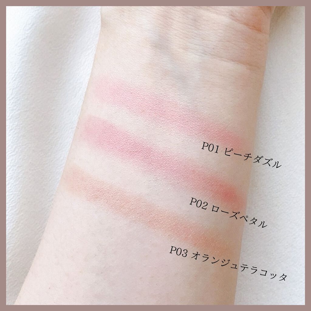 - <P01 ピーチダズル> トリエチルヘキサノイン、ジメチコン、シリカ、(ジメチコン/ビニルジメチコン)クロスポリマー、合成フルオロフロゴパイト、スクワラン、オリーブ果実油、ホホバ種子油、カニナバラ果実油、マイクロクリスタリンワックス、パラフィン、フェノキシエタノール、トコフェロール、ジパルミチン酸アスコルビル、リンゴ酸ジイソステアリル、タルク、マイカ、酸化チタン、酸化鉄、赤226、赤202、水酸化Al、酸化スズ <P05 ペールライラック> トリエチルヘキサノイン、ジメチコン、合成フルオロフロゴパイト、シリカ、(ジメチコン/ビニルジメチコン)クロスポリマー、スクワラン、オリーブ果実油、ホホバ種子油、カニナバラ果実油、マイクロクリスタリンワックス、パラフィン、フェノキシエタノール、トコフェロール、ジパルミチン酸アスコルビル、リンゴ酸ジイソステアリル、マイカ、酸化チタン、酸化鉄、赤226、赤202、コンジョウ、水酸化Al、酸化スズ <P02 ローズペタル> トリエチルヘキサノイン、ジメチコン、シリカ、(ジメチコン/ビニルジメチコン)クロスポリマー、合成フルオロフロゴパイト、スクワラン、オリーブ果実油、ホホバ種子油、カニナバラ果実油、マイクロクリスタリンワックス、パラフィン、フェノキシエタノール、トコフェロール、ジパルミチン酸アスコルビル、リンゴ酸ジイソステアリル、タルク、マイカ、酸化チタン、酸化鉄、赤202、赤226、コンジョウ、水酸化Al、酸化スズ