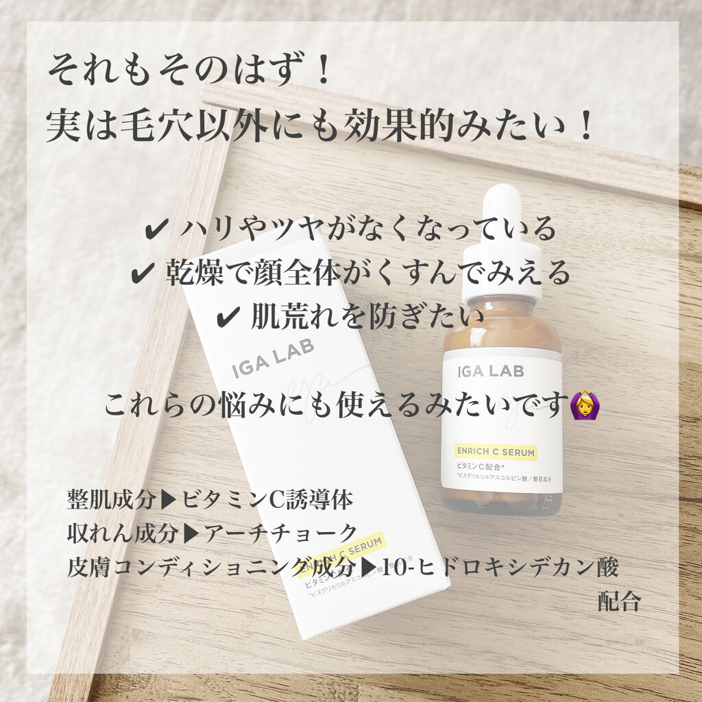 - 過剰な皮脂が毛穴トラブルの原因であることに着目した、皮膚の専門家開発のビタミンC誘導体配合の美容液。ビタミンC誘導体以外にも毛穴に多角的にアプローチする成分を厳選して配合。 皮脂でお悩みの方にも使いやすいように「ミニマムオイル処方」を採用。肌を引き締め、滑らかな素肌へ導きます。 毛穴へのアプローチだけではなく、角質層のすみずみまで保湿成分を届け、長時間潤いしっとりした肌が続きます。 スウィートシトラスの香り。 肌に優しい敏感肌のための7つのフリーを実現。着色料、合成香料、鉱物油、石油系界面活性剤、紫外線吸収剤、パラベン、アルコール(エタノール)不使用。