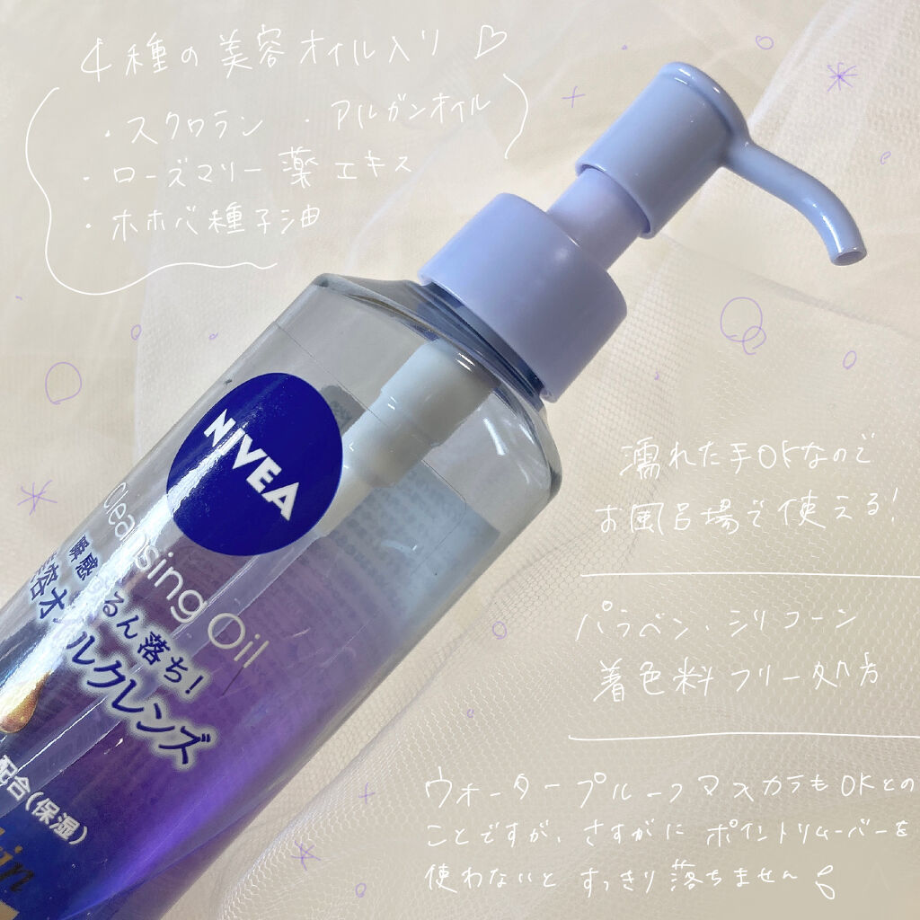 ニベアの美容オイルクレンズは、つるさらオイル。つるっと指滑りの良いさらっとなめらかな使い心地のオイルがするんと瞬時に肌にひろがってなじむから、こすらなくてOK。 洗い上がりつっぱらないからほんと使いやすい𓈒𓏸𓐍 アイラインやマスカラはがっつり派じゃないけど、たまーに引くアイラインもしっかりおちてるから洗浄力も申し分なさそう💪 無くなってもまた買います💸 ͗ ͗︎︎