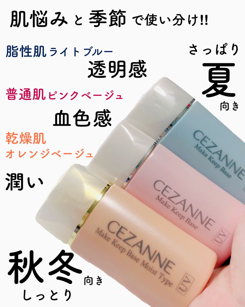 プチプラなのに超高レビューの下地✨ 正直期待してませんでした…が‼︎ えーーー⁈なんでこの価格なのー⁈ いい意味で期待を裏切られました(笑) ライトブルー 液体のみずみずしいテクスチャー 伸ばしやすくサラッサラ✨ 透明感のある肌に✨ 夏に快適な感じ◎ ピンクベージュ こちらもサラッとしたテクスチャー ほんの〜りピンクになるので 血色感あるお肌に✨ オールシーズン使える◎ オレンジベージュ リキッドファンデ並みのしっとり感 3色の中で1番カバー力あり✨ ほんのりパール感✨ ちょっとしたお出かけなら +おしろいくらいでOK♪ 秋冬にオススメ◎ 乾燥肌の方にオススメ 注意:参考になればいいな…と 具体的に表記しましたが 全色オールシーズンOKです♪ 普通〜混合肌の私は全色使います(笑)