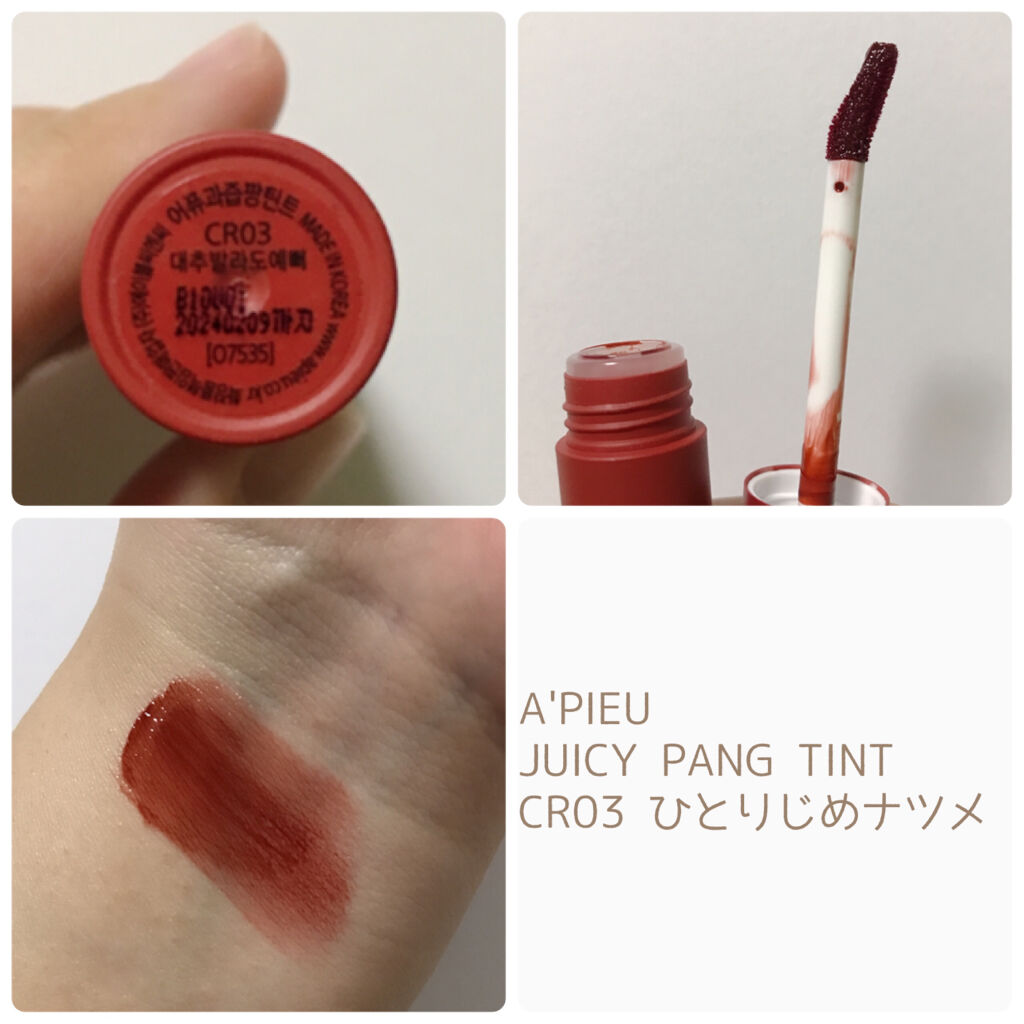 ❤️A’pieuジューシーパンスパークリングティントCR01オトメなナツメ❤️うるうるキラキラな可愛い唇に仕上がるティント💄💕ラメ入りですがザラザラ感はなく、ちゅるんとした仕上がりです😚こっくりとしたブラウンコーラルにラメが入っていて華やかで...