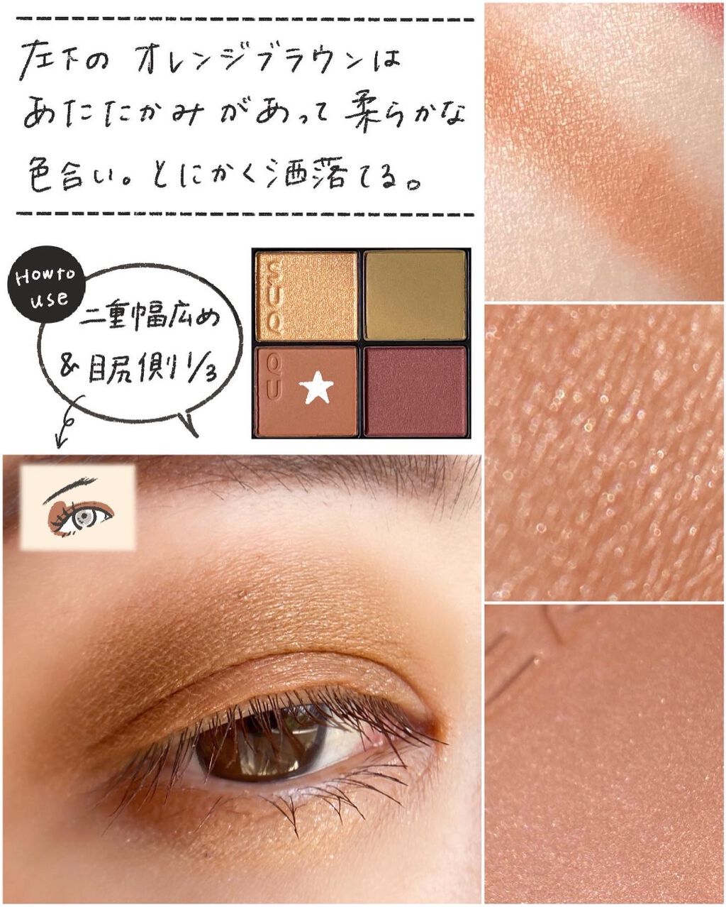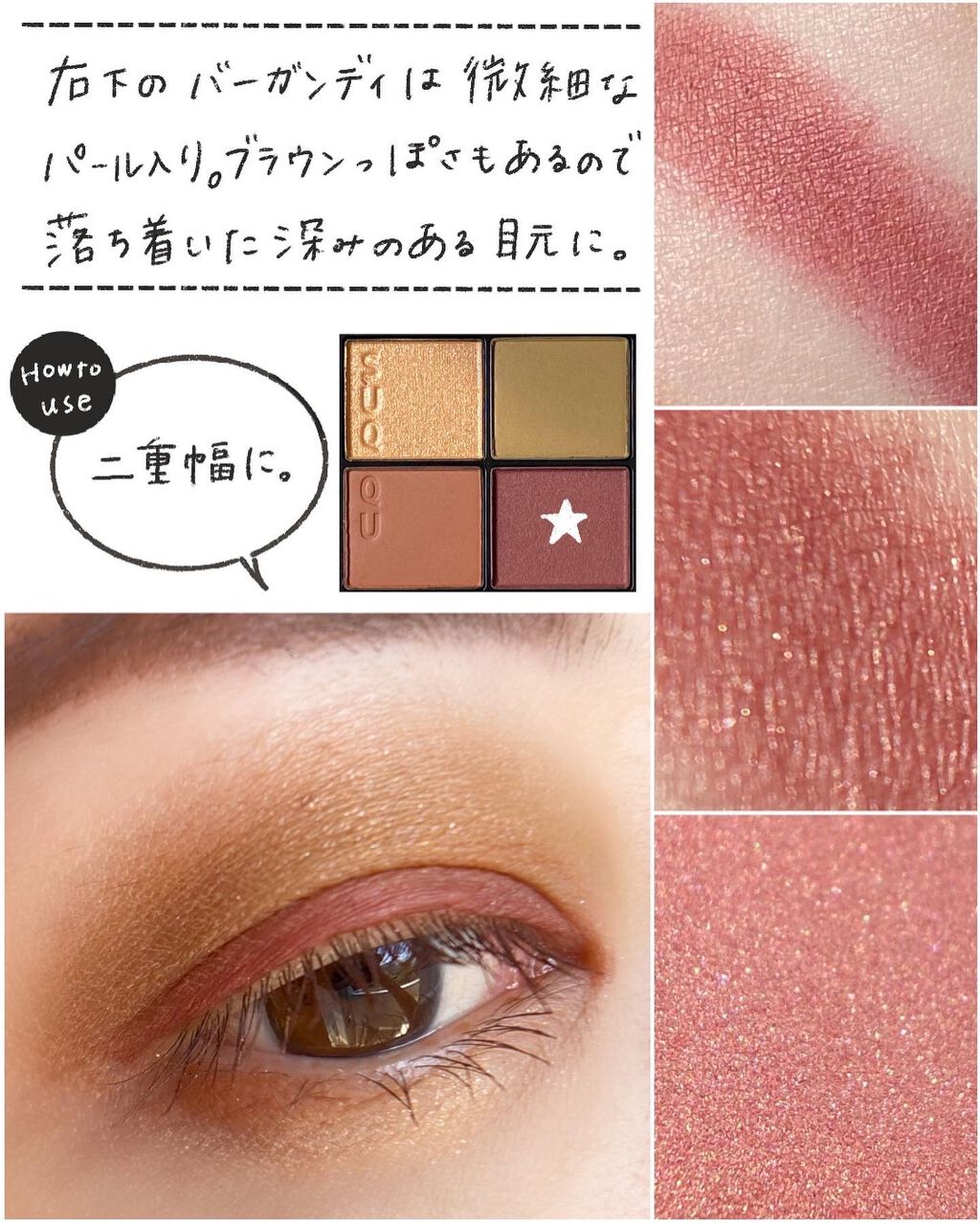アンプリのベーシック系のカラーの中でもひときわニュートラルな、色味を削いだようなベージュブラウン。 こちらも少し前(7/30)にレビューしているのでそちらもご参考いただけたら🙇♀️ このパレットはベーシックでありながらトレンド感もあるところがお気に入りポイントでして、ちょっとセピアを帯びたようなくすみ感がなんとも言えずお洒落な雰囲気を醸し出してくれます。 というのは全体的に肌に馴染むようなヌーディカラーで構成されたすごくナチュラルなシェードなんだけど、シルバー系のパールが潜んでいたり、少しくすみ感があったりと、甘さを取り除いてクールな仕上がりになるところがめちゃくちゃかっこいいのよ。 ダイヤモンドを彷彿とさせるような大粒のラメの煌めきがたまらなく美しいアイカラーです。 このパレットの好きなところは、マットが主役なところ。絶妙にニュアンスの異なる3色のマットでグラデーションしやすいのがミソです。 パールカラーの入れ方次第で表情が変わるパレットだと思う。