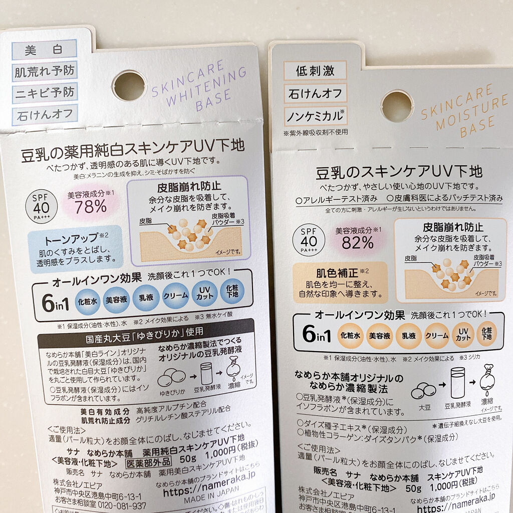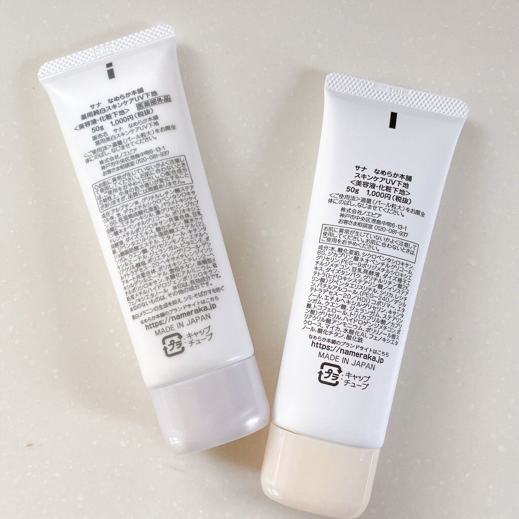 オールインワンなので洗顔後、これ1つでOKの便利アイテム! 時間のない朝に重宝した。どちらもベタつかず、艶っとした仕上がり。 なめらか本舗・スキンケアUV下地NC・薬用純白スキンケアUV下地N【医薬部外品】