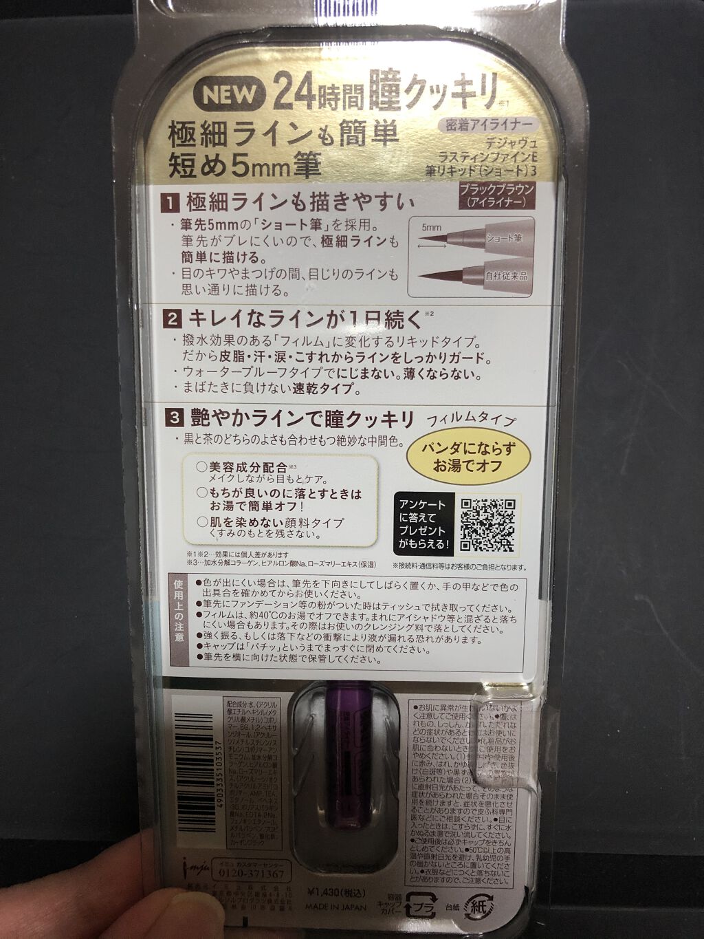 - 極細ラインも描きやすい 短め5㎜のリキッドアイライナー ・筆先5㎜のショート筆を採用。筆先が安定してブレにくく、極細ラインも簡単に描けます。 ・ラインキープ剤を高配合しているので、皮脂・汗・こすれからラインをしっかりガード。 ・もちが良いのに、お湯で落とせるフィルムタイプ。