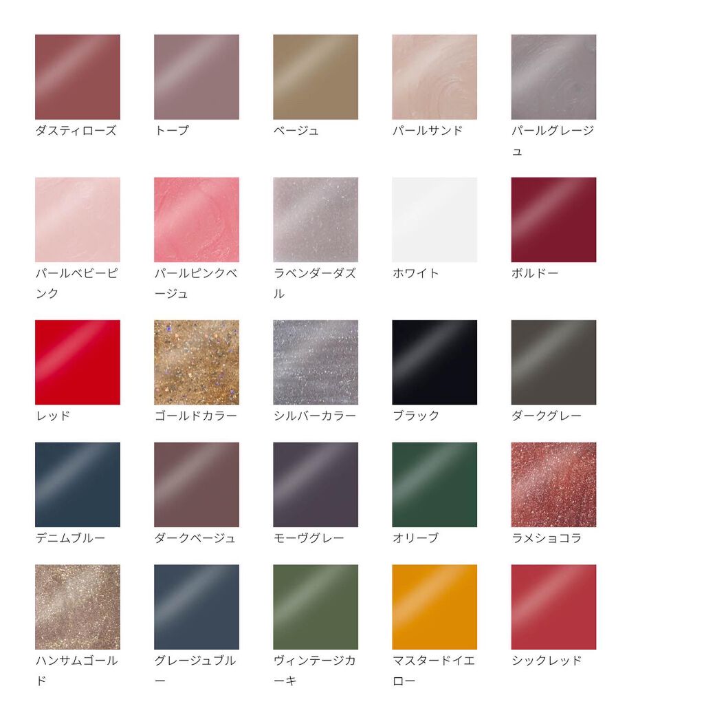 - <リッチミルク> 酢酸エチル、酢酸ブチル、(アジピン酸/ネオペンチルグリコール/無水トリメリト酸)コポリマー、ニトロセルロース、クエン酸アセチルトリブチル、イソプロパノール、ステアラルコニウムヘクトライト、オキシベンゾン−1、(+/-)、酸化チタン、赤201、赤202、赤220、黄4、青1、酸化鉄、コンジョウ、グンジョウ、マイカ、青205 <ネイビー> 酢酸エチル、酢酸ブチル、(アジピン酸/ネオペンチルグリコール/無水トリメリト酸)コポリマー、ニトロセルロース、クエン酸アセチルトリブチル、イソプロパノール、ステアラルコニウムヘクトライト、オキシベンゾン−1、(+/-)、酸化チタン、赤201、赤202、赤220、黄4、青1、酸化鉄、コンジョウ、グンジョウ、マイカ、青205 <ダークベージュ> 酢酸エチル、酢酸ブチル、(アジピン酸/ネオペンチルグリコール/無水トリメリト酸)コポリマー、ニトロセルロース、クエン酸アセチルトリブチル、イソプロパノール、ステアラルコニウムヘクトライト、オキシベンゾン−1、(+/-)、酸化チタン、赤201、赤202、赤220、黄4、青1、酸化鉄、コンジョウ、グンジョウ、マイカ、青205 <ゴールドカラー> 酢酸エチル、酢酸ブチル、(アジピン酸/ネオペンチルグリコール/無水トリメリト酸)コポリマー、ニトロセルロース、クエン酸アセチルトリブチル、イソプロパノール、ステアラルコニウムヘクトライト、オキシベンゾン−1、(+/-)、酸化チタン、赤201、赤202、赤220、黄4、青1、酸化鉄、コンジョウ、グンジョウ、マイカ、青205 <モーヴグレー> 酢酸エチル、酢酸ブチル、(アジピン酸/ネオペンチルグリコール/無水トリメリト酸)コポリマー、ニトロセルロース、クエン酸アセチルトリブチル、イソプロパノール、ステアラルコニウムヘクトライト、オキシベンゾン−1、(+/-)、酸化チタン、赤201、赤202、赤220、黄4、青1、酸化鉄、コンジョウ、グンジョウ、マイカ、青205 <シルバーカラー> 酢酸エチル、酢酸ブチル、(アジピン酸/ネオペンチルグリコール/無水トリメリト酸)コポリマー、ニトロセルロース、クエン酸アセチルトリブチル、イソプロパノール、ステアラルコニウムヘクトライト、オキシベンゾン−1、(+/-)、酸化チタン、赤201、赤202、赤220、黄4、青1、酸化鉄、コンジョウ、グンジョウ、マイカ、青205 <オリーブ> 酢酸エチル、酢酸ブチル、(アジピン酸/ネオペンチルグリコール/無水トリメリト酸)コポリマー、ニトロセルロース、クエン酸アセチルトリブチル、イソプロパノール、ステアラルコニウムヘクトライト、オキシベンゾン−1、(+/-)、酸化チタン、赤201、赤202、赤220、黄4、青1、酸化鉄、コンジョウ、グンジョウ、マイカ、青205 <ブラック> 酢酸エチル、酢酸ブチル、(アジピン酸/ネオペンチルグリコール/無水トリメリト酸)コポリマー、ニトロセルロース、クエン酸アセチルトリブチル、イソプロパノール、ステアラルコニウムヘクトライト、オキシベンゾン−1、(+/-)、酸化チタン、赤201、赤202、赤220、黄4、青1、酸化鉄、コンジョウ、グンジョウ、マイカ、青205 <シックレッド> 酢酸エチル、酢酸ブチル、(アジピン酸/ネオペンチルグリコール/無水トリメリト酸)コポリマー、ニトロセルロース、クエン酸アセチルトリブチル、イソプロパノール、ステアラルコニウムヘクトライト、オキシベンゾン−1、(+/-)、酸化チタン、赤201、赤202、赤220、黄4、青1、酸化鉄、コンジョウ、グンジョウ、マイカ、青205 <グレージュブルー> 酢酸エチル、酢酸ブチル、(アジピン酸/ネオペンチルグリコール/無水トリメリト酸)コポリマー、ニトロセルロース、クエン酸アセチルトリブチル、イソプロパノール、ステアラルコニウムヘクトライト、オキシベンゾン−1、(+/-)、酸化チタン、赤201、赤202、赤220、黄4、青1、酸化鉄、コンジョウ、グンジョウ、マイカ、青205 <デニムブルー> 酢酸エチル、酢酸ブチル、(アジピン酸/ネオペンチルグリコール/無水トリメリト酸)コポリマー、ニトロセルロース、クエン酸アセチルトリブチル、イソプロパノール、ステアラルコニウムヘクトライト、オキシベンゾン−1、(+/-)、酸化チタン、赤201、赤202、赤220、黄4、青1、酸化鉄、コンジョウ、グンジョウ、マイカ、青205 <ニュアンスパープル> 酢酸エチル、酢酸ブチル、(アジピン酸/ネオペンチルグリコール/無水トリメリト酸)コポリマー、ニトロセルロース、クエン酸アセチルトリブチル、イソプロパノール、ステアラルコニウムヘクトライト、オキシベンゾン−1、(+/-)、酸化チタン、赤201、赤202、赤220、黄4、青1、酸化鉄、コンジョウ、グンジョウ、マイカ、青205 <ヴィンテージカーキ> 酢酸エチル、酢酸ブチル、(アジピン酸/ネオペンチルグリコール/無水トリメリト酸)コポリマー、ニトロセルロース、クエン酸アセチルトリブチル、イソプロパノール、ステアラルコニウムヘクトライト、オキシベンゾン−1、(+/-)、酸化チタン、赤201、赤202、赤220、黄4、青1、酸化鉄、コンジョウ、グンジョウ、マイカ、青205 <ピーチピンク> 酢酸エチル、酢