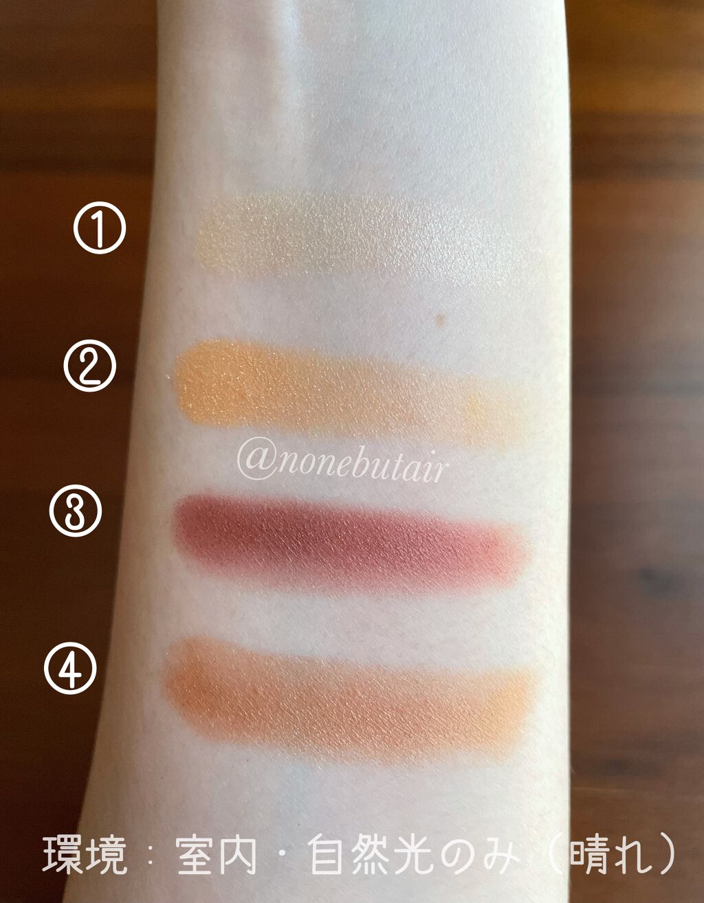 こちら完全に好みのカラーで、わたくし脊髄反射で購入いたしました。では、実際に何度かメイクをしてみて感じたことをお伝えしますね♪※写真の撮影環境はすべて、室内・自然光(薄曇り)のみで加工なしです。まずは真ん中の色以外でのメイク。真ん中以外はベー...