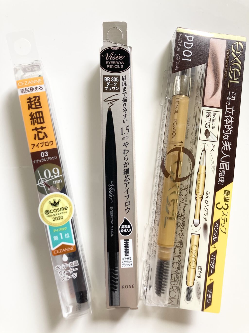 excel パウダー&ペンシル アイブロウEX ペンシル・パウダー・スクリューブラシの3役! 1本で完成できて便利。パウダーはふんわりついて 楕円形の芯はスルスルと描き心地が良いです。 Visee アイブロウペンシルS 1.5mmの細芯。この1.5mmの細さが絶妙に良く、 細く描けるのに折れづらいです。安い価格でスクリューブラシ付きなのは嬉しい! CEZANNE 超細芯アイブロウ 0.9mmの超細芯なので毛の足りないところを 1本1本、自然に描き足せることができて 細部までとても丁寧に仕上がります。