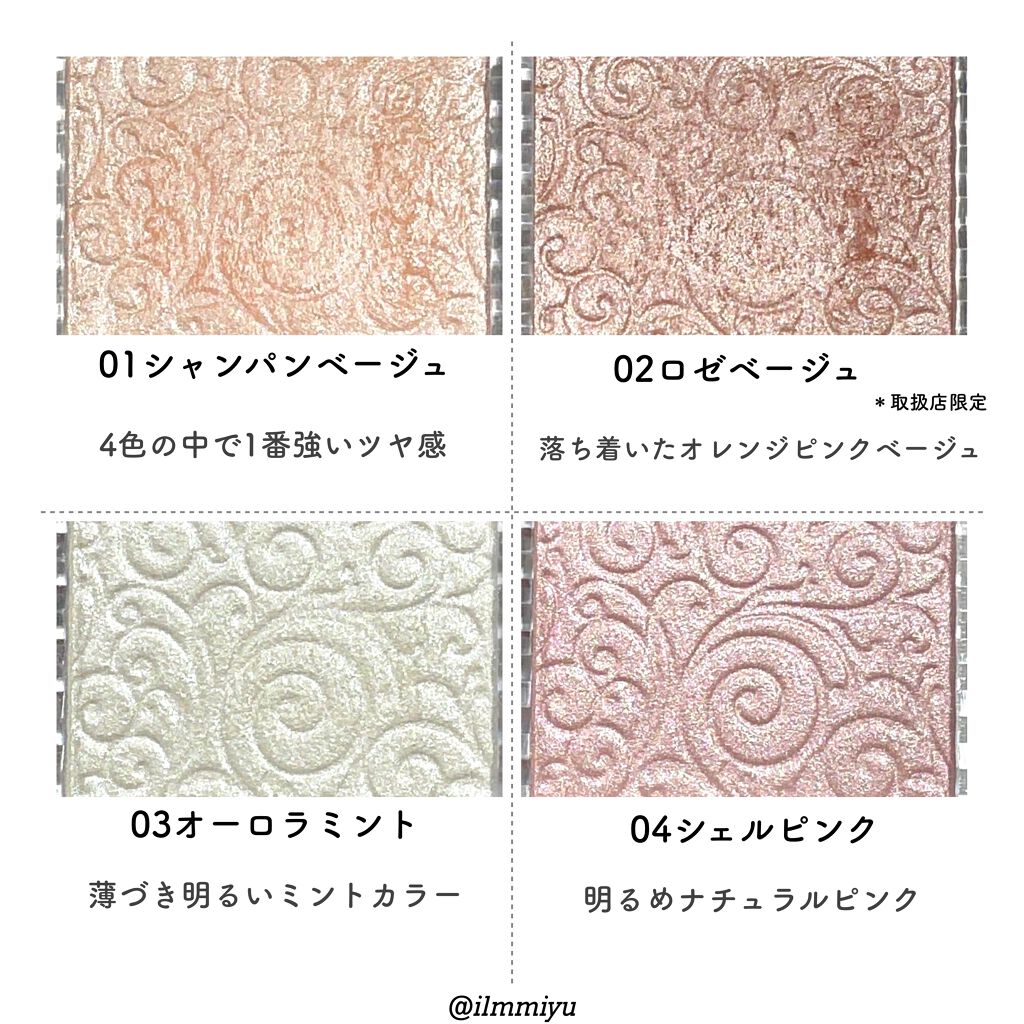 - <01 シャンパンベージュ> トリイソステアリン酸ポリグリセリル-2、トリエチルヘキサノイン、(フッ化/水酸化/酸化)/(Mg/K/ケイ素)、ヘキサ(ヒドロキシステアリン酸/ステアリン酸/ロジン酸)ジペンタエリスリチル、ミリスチン酸亜鉛、(HDI/トリメチロールヘキシルラクトン)クロスポリマー、ペンチレングリコール、ビスジグリセリルポリアシルアジペート-2、フェノキシエタノール、ハイドロゲンジメチコン、メチルパラベン、シリカ、トコフェロール、BG、水、ヒアルロン酸Na、カミツレ花エキス、ラベンダー花エキス、ローズマリー葉エキス、タルク、マイカ、酸化チタン、酸化鉄、酸化スズ、水酸化Al <02 ロゼベージュ> トリイソステアリン酸ポリグリセリル-2、トリエチルヘキサノイン、(フッ化/水酸化/酸化)/(Mg/K/ケイ素)、ヘキサ(ヒドロキシステアリン酸/ステアリン酸/ロジン酸)ジペンタエリスリチル、ミリスチン酸亜鉛、(HDI/トリメチロールヘキシルラクトン)クロスポリマー、ペンチレングリコール、ビスジグリセリルポリアシルアジペート-2、フェノキシエタノール、ハイドロゲンジメチコン、メチルパラベン、シリカ、トコフェロール、BG、水、ヒアルロン酸Na、カミツレ花エキス、ラベンダー花エキス、ローズマリー葉エキス、タルク、マイカ、酸化チタン、酸化鉄、酸化スズ、水酸化Al <03 オーロラミント> トリイソステアリン酸ポリグリセリル-2、トリエチルヘキサノイン、(フッ化/水酸化/酸化)/(Mg/K/ケイ素)、ヘキサ(ヒドロキシステアリン酸/ステアリン酸/ロジン酸)ジペンタエリスリチル、ミリスチン酸亜鉛、(HDI/トリメチロールヘキシルラクトン)クロスポリマー、ペンチレングリコール、ビスジグリセリルポリアシルアジペート-2、フェノキシエタノール、ハイドロゲンジメチコン、メチルパラベン、シリカ、トコフェロール、BG、水、ヒアルロン酸Na、カミツレ花エキス、ラベンダー花エキス、ローズマリー葉エキス、タルク、マイカ、酸化チタン、合成フルオロフロゴパイト、酸化鉄、酸化スズ、グンジョウ、水酸化Al <04 シェルピンク> トリイソステアリン酸ポリグリセリル-2、トリエチルヘキサノイン、(フッ化/水酸化/酸化)/(Mg/K/ケイ素)、ヘキサ(ヒドロキシステアリン酸/ステアリン酸/ロジン酸)ジペンタエリスリチル、ミリスチン酸亜鉛、(HDI/トリメチロールヘキシルラクトン)クロスポリマー、ペンチレングリコール、ビスジグリセリルポリアシルアジペート-2、フェノキシエタノール、ハイドロゲンジメチコン、メチルパラベン、シリカ、トコフェロール、BG、水、ヒアルロン酸Na、カミツレ花エキス、ラベンダー花エキス、ローズマリー葉エキス、タルク、マイカ、酸化チタン、酸化鉄、グンジョウ、酸化スズ、水酸化Al