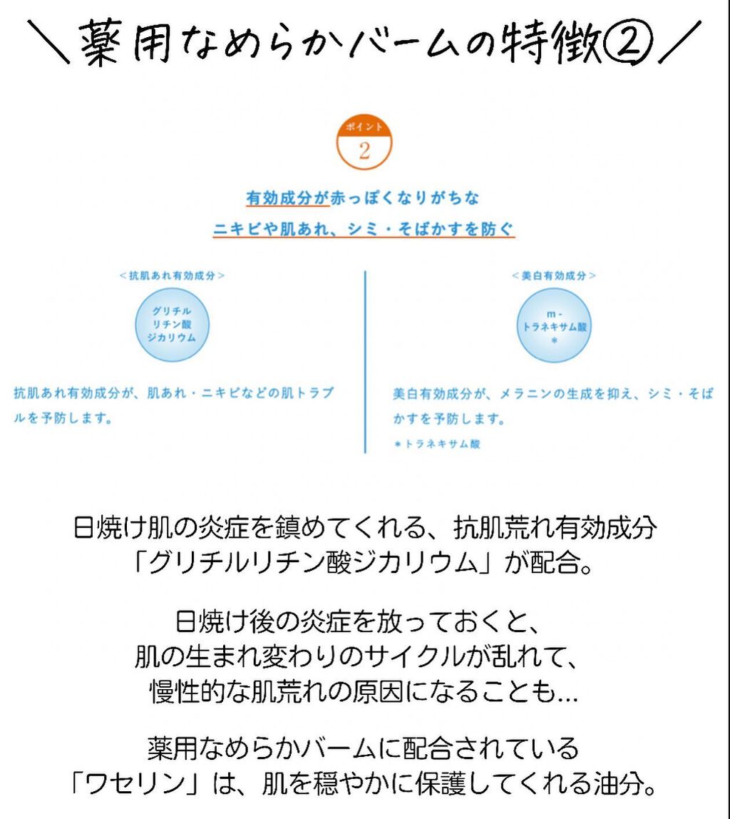 - 【医薬部外品】 新パッケージへリニューアル。 残りやすい赤み・シミ作りたくない。薬用なめらかバーム。美白有効成分「m-トラネキサム酸*」を配合。 メラニンの生成を抑え、シミ・そばかすを防ぎます。 また、抗肌荒れ有効成分で赤っぽくなりがちな肌荒れやニキビを防ぎます。 ひと肌でとろけてなめらかに広がり、べたつかず、みずみずしい美容クリームのような使い心地で、オールシーズン使えます。 敏感肌設計。 ○厳選原料・成分配合 ○パラベン(防腐剤)無添加、アルコール(エチルアルコール)無添加 ○無香料、無着色、弱酸性 〇アレルギーテスト済み・ニキビのもとになりにくい処方(全てのかたにアレルギーが起きない、また、ニキビができないわけではありません。) *トラネキサム酸 ※商品の改良や表示方法の変更などにより、実際の成分と一部異なる場合があります。実際の成分は商品の表示をご覧ください。