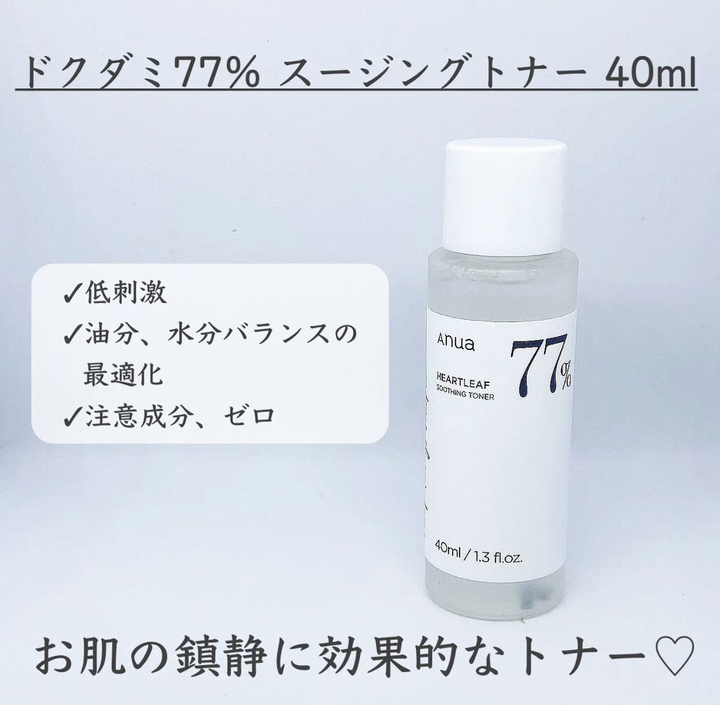 液体の77%がドクダミエキス※! ※整肌成分 軽くてとろみのあるテクスチャーで肌馴染みが良い使い心地です。 ダメージを受けた肌にも朝晩使えて人気の理由がわかるトナーでした♡