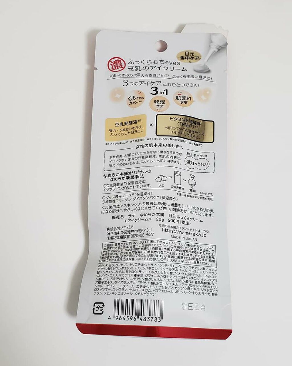 - <目元ふっくらクリーム NC> 水、グリセリン、スクワラン、テトラエチルヘキサン酸ペンタエリスリチル、BG、テトラ(ヒドロキシステアリン酸/イソステアリン酸)ジペンタエリスリチル、ジメチコン、ベヘニルアルコール、PEG-150、ジイソステアリン酸ポリグリセリル-2、ジグリセリン、ミツロウ、イソステアリン酸PEG-60グリセリル、ペンチレングリコール、ステアリン酸グリセリル、トコフェリルリン酸Na、トリメチルシロキシケイ酸、豆乳イソフラボン、豆乳発酵液、(アクリレーツ/アクリル酸アルキル(C10-30))クロスポリマー、エタノール、エチルヘキシルグリセリン、キサンタンガム、シクロデキストリン、ダイズイソフラボン、ダイズタンパク、ダイズ種子エキス、トコフェロール、トリ(カプリル酸/カプリン酸)グリセリル、ポリソルベート80、マカデミア種子油、ラウリルカルバミン酸イヌリン、レシチン、酸化チタン、水酸化Na、フェノキシエタノール、メチルパラベン <目元ふっくらクリーム【旧】> 水、BG、グリセリン、トリエチルヘキサノイン、テトラ(ヒドロキシステアリン酸/イソステアリン酸)ジペンタエリスリチル、ジメチコン、ベヘニルアルコール、テトラエチルヘキサン酸ペンタエリスリチル、ミツロウ、ラウロイルグルタミン酸ジ(オクチルドデシル/フィトステリル/ベヘニル)、マカデミア種子油、ジフェニルシロキシフェニルトリメチコン、イソステアリン酸PEG-60グリセリル、ステアリン酸グリセリル、トコフェリルリン酸Na、豆乳発酵液、ダイズ種子エキス、ダイズタンパク、(アクリル酸ヒドロキシエチル/アクリロイルジメチルタウリンNa)コポリマー、エタノール、エチルヘキシルグリセリン、カンゾウ根エキス、ジメチコンクロスポリマー、スクワラン、セルロースガム、トコフェロール、ポリソルベート60、マイカ、酸化チタン、フェノキシエタノール、メチルパラベン