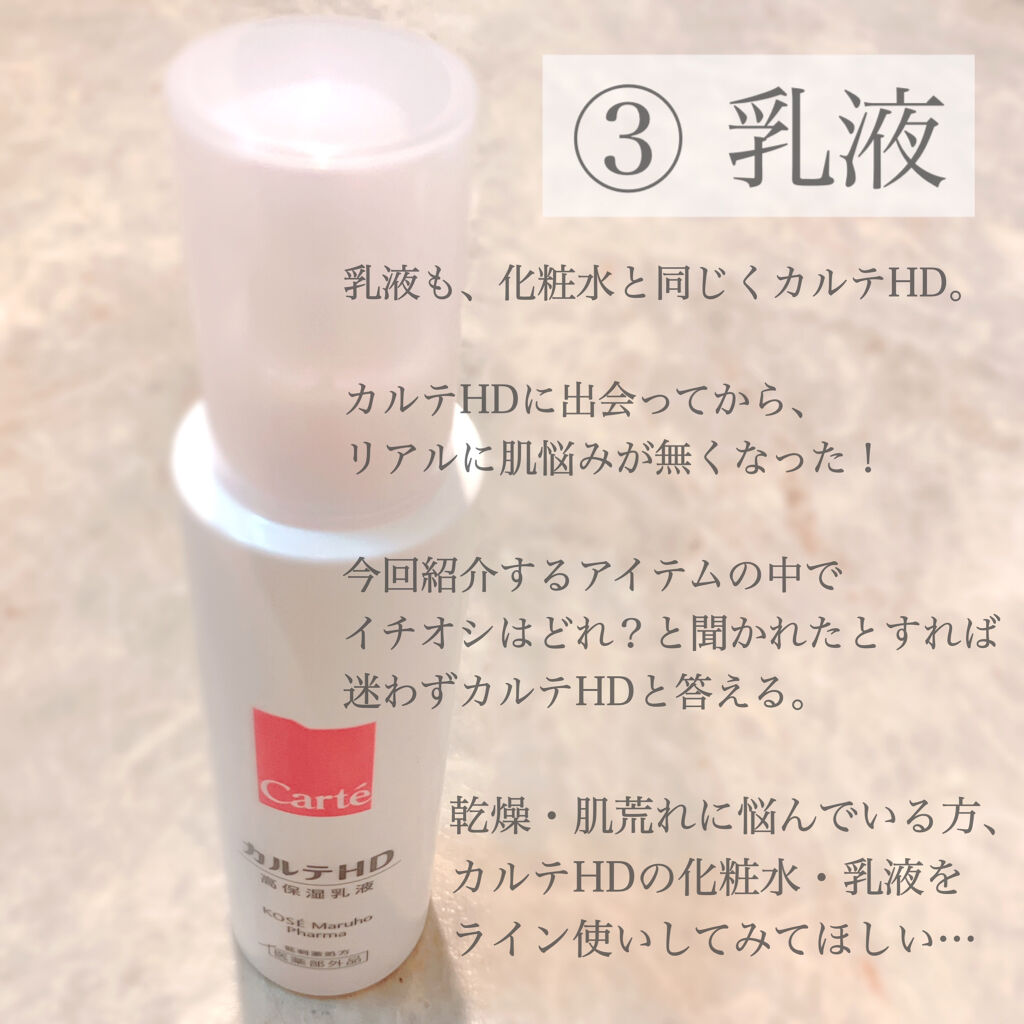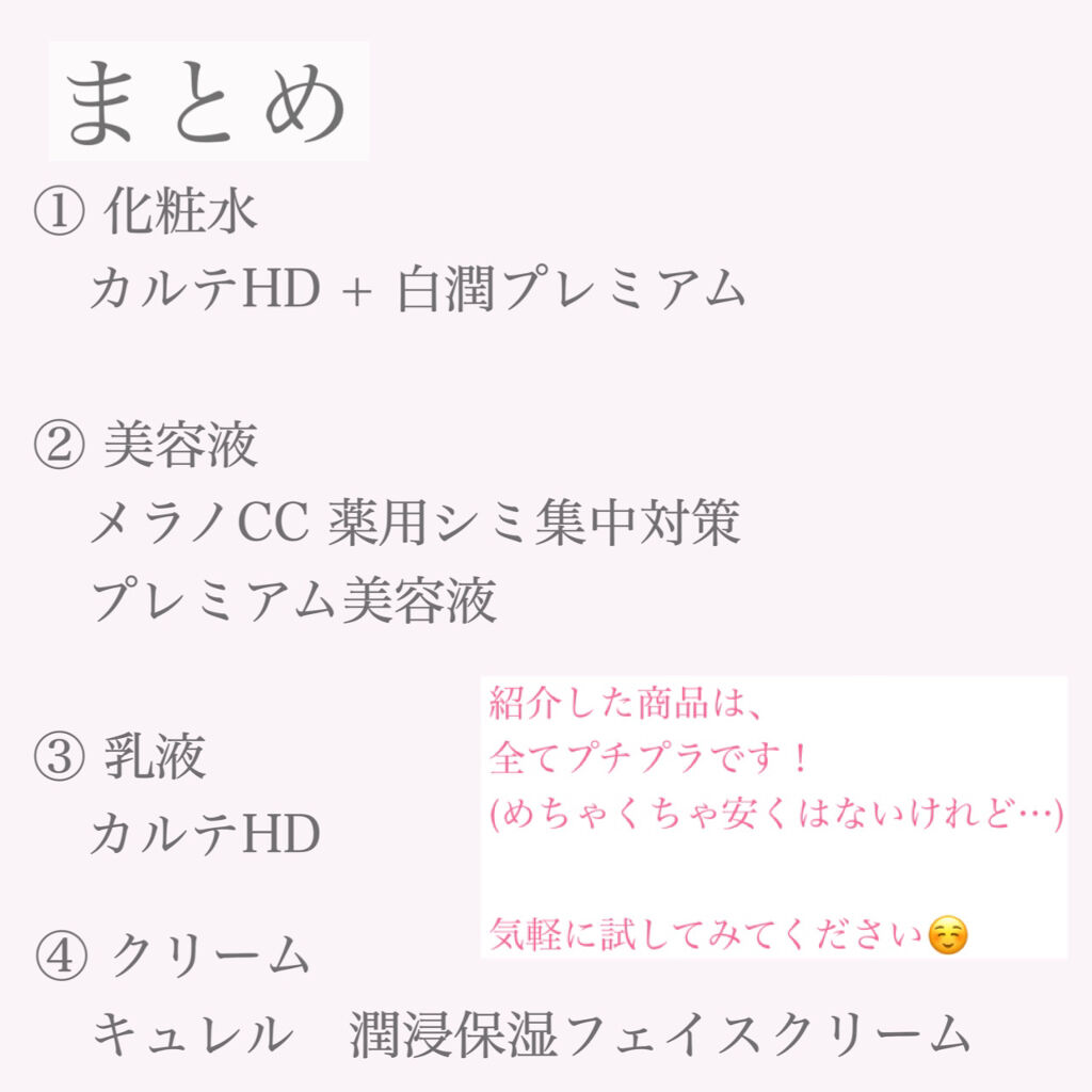 わたしは、ビューティーザバイブルで小林ひろ美さんが紹介していた化粧水の「601円づけ」を実践しています🙌🏻 化粧水を、500円玉大・100円玉大・1円玉大に分けて塗ることで浸透率を高めるというものです。 その日の肌状態に合わせて、カルテHDを多めに塗ったり白潤プレミアムを多めに塗ったりと調整しています。 どちらもしっとりしたとろみのある感触で、個人的に好みです。 朝にビタミンCを塗ることで日焼けしにくくなり、また夜に塗ることでシミ予防&ニキビ予防になります。 化粧水と乳液のライン使いで、乾燥知らずの肌になれます! ベタつかないので朝のメイク前にも余裕で使えます! セラミドを補うことで、肌バリアを高めてくれます🥰