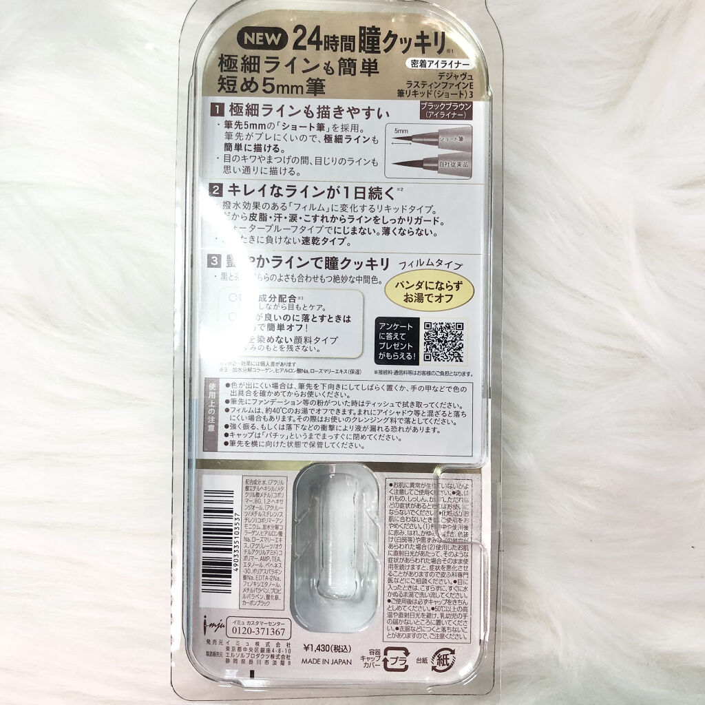 - 極細ラインも描きやすい 短め5㎜のリキッドアイライナー ・筆先5㎜のショート筆を採用。筆先が安定してブレにくく、極細ラインも簡単に描けます。 ・ラインキープ剤を高配合しているので、皮脂・汗・こすれからラインをしっかりガード。 ・もちが良いのに、お湯で落とせるフィルムタイプ。