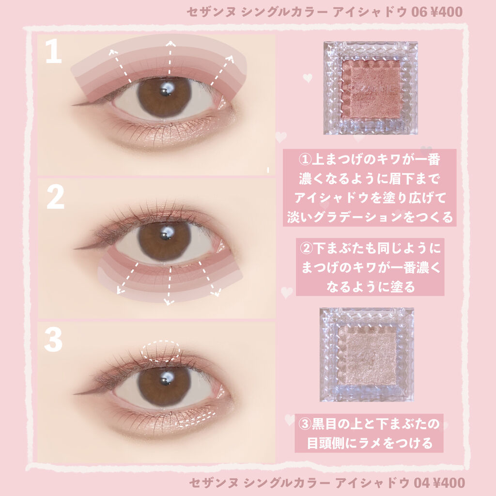 ・涙袋の影の部分まで、ベースを塗ることで縦幅がかなり強調されて丸目にみえる! ・アイシャドウの陰影とラメのハイライト効果で奥まった目に光を取り込んで出目っぽくみせる! ・淡いピンクのアイシャドウ、艶のようなラメ、細くて短いブラックアイラインが特徴 ・つり目を自然にいかせて、美人な雰囲気になれる! ・単色メイクは簡単そうに見えて難しいけど、ブラシを使うと綺麗なグラデーションになる! ・目の形によって中間色をどこまで入れるか変わるけど「目を開けた時に5mm見える」を基準にする