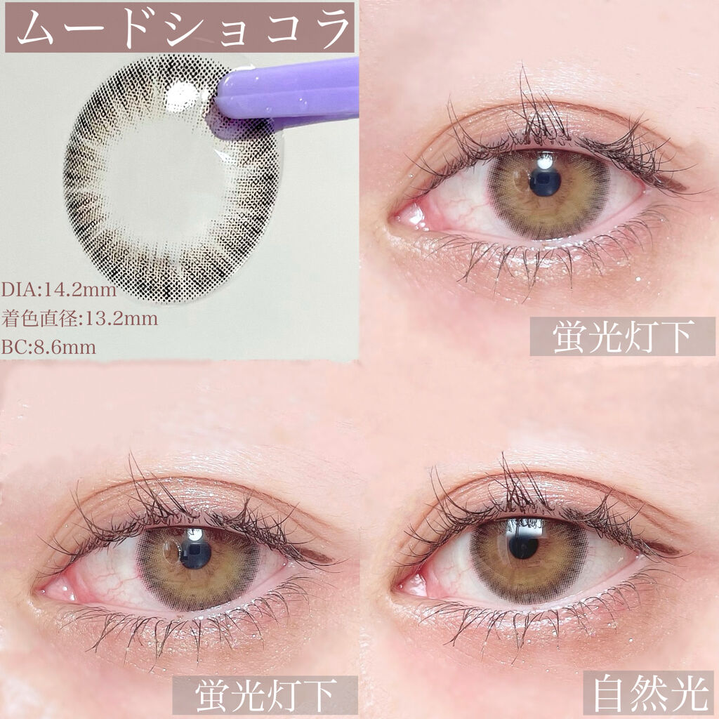 - 〝瞳に澄んだ輝きを〟 装用期間 : ワンデー(1日使い捨て) 全体直径(Dia) : 14.20 mm 着色直径 : ヌーディブラウン 13.20 mm /ヌーディグレイ 13.20mm ジャスミンピンク 13.10mm ムードショコラ 13.20mm B.C : 8.60 mm 含水率 :38.5%