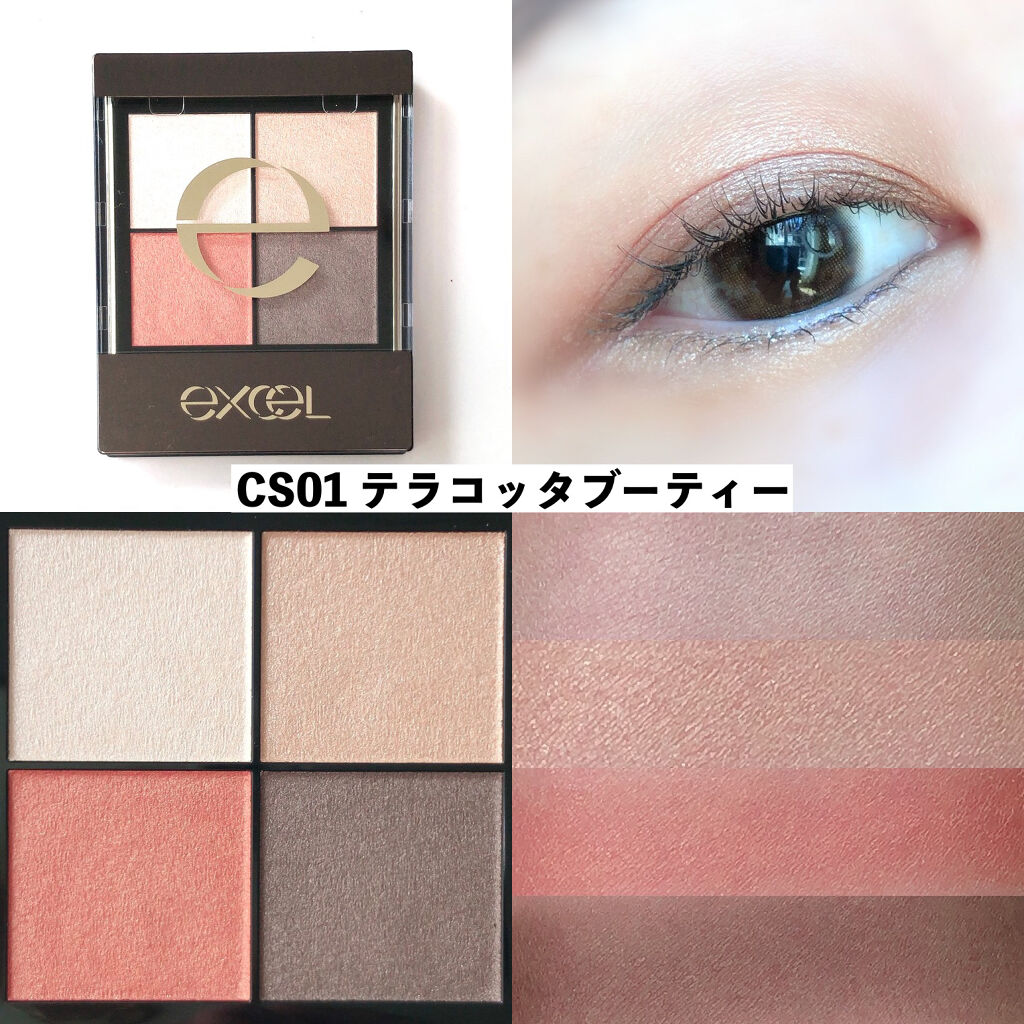 - 1.重ねてもくすまないクリアな発色。ナチュラルに溶け合う絶妙4カラー。 ツヤタイプ(左上・左下カラー):アイホール全体にぼかしたり、目尻へのポイント使いも。 ラメタイプ(右上カラー):アイホール中心や下まぶたにきらめきのアクセント。 マットタイプ(右下カラー):単色で陰影を付けたり、ツヤタイプと重ねてニュアンスをプラス。 2.うっとりするほどリッチな質感で粉飛びしないのに、軽いタッチで伸びて重ねやすいテクスチャー。 3.スクワラン(保湿)配合で目元の乾燥を防ぎます。 [PERFORMANCE] 色と質感の重ね着を楽しむ、ファッション感覚アイシャドウパレット [DESIGN] ・まぶたにひっかからない、なめらかな上質チップ ・薄型コンパクトだからポーチの中でかさばらない [QUALITY] 1.重ねてもくすまないクリアな発色 ナチュラルに溶け合う絶妙4カラー 2.パールの重ね技でまぶたに極上のツヤ感 微細多色 カラーパール 銀コーティング ガラスパール* excel GOLD-MIX処方(金パール配合)* (*右上のシャイニーカラーのみ) 3.うっとりするほどリッチな質感で粉飛び知らず!なのに、軽いタッチで伸びて重ねやすい 4.スクワラン(保湿)配合で目元の乾燥を防ぐ