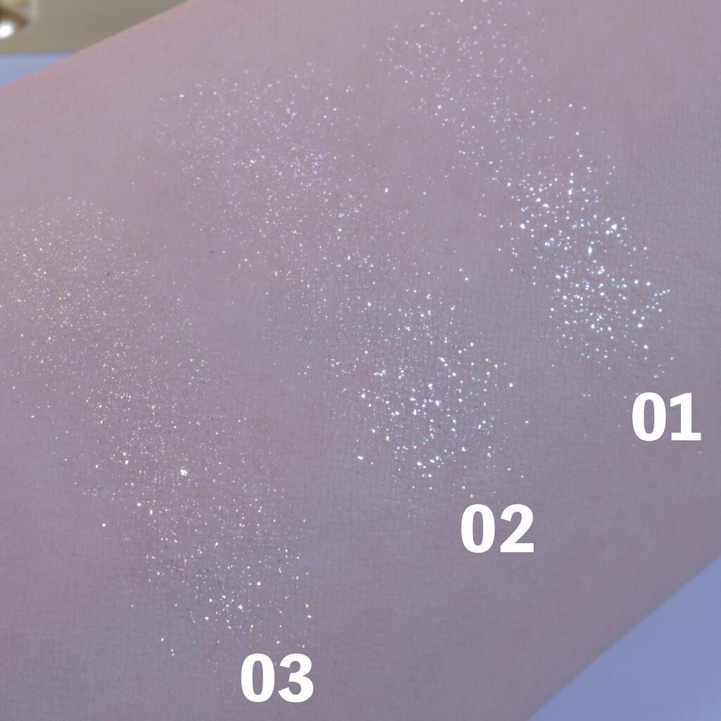 - 「ダイヤモンドのような輝き」天の川のように輝く、透明感と輝きに優れた真珠のような光沢。 複数のファインダイヤモンドの輝きを再現 <01 シルバーホワイト> シルバーホワイトのカラーが美しく輝いてツヤと透明感をプラス。なめらかでモチっとしたテクスチャーと小粒のラメが美しいツヤ肌を演出。Tゾーンや頬骨、デコルテなど光を与えたい部分に塗ればダイアモンドのように輝く。 <02 ライトシャンパン> ライトシャンパンのカラーが血色感と自然な光沢感をプラス。なめらかでモチっとしたテクスチャーと小粒のラメが美しいツヤ肌を演出。Tゾーンや頬骨、デコルテなど光を与えたい部分に塗ればダイアモンドのように輝く。 <03 シャンパンゴールド> シャンパンゴールドのカラーが表情を華やかに引き立てる。なめらかでモチっとしたテクスチャーと小粒のラメが美しいツヤ肌を演出。Tゾーンや頬骨、デコルテなど光を与えたい部分に塗ればダイアモンドのように輝く。 <05 シャンパンピンク> シャンパンピンクのカラーが血色感と透明感を与える。チークに重ねればピンクが引き立つ!なめらかでモチっとしたテクスチャーと小粒のラメが美しいツヤ肌を演出。Tゾーンや頬骨、デコルテなど光を与えたい部分に塗ればダイアモンドのように輝く。 <N01 シルバーホワイト> シルバーカラーのきらめきで、一瞬で透明感ある印象に。 小粒パール+大粒グリッターの組み合わせが、星屑のように繊細かつ大胆に煌めいてワンランク上のメイクに仕上げる。なめらか&モチっとした使用感で肌に高密着。 光を反射させる高屈折オイル配合でどの角度でもツヤ肌を実現。 鼻・頬・目頭・眉下以外にも、肩やデコルテに仕込めばお顔のツヤとリンクして、内から輝くような自然な印象に。 <N02 ライトシャンパン> ライトシャンパンのカラーが肌の色に自然になじみながら、ほどよいツヤと立体感をプラス。 小粒パール+大粒グリッターの組み合わせが、星屑のように繊細かつ大胆に煌めいてワンランク上のメイクに仕上げる。 なめらか&モチっとした使用感で肌に高密着。光を反射させる高屈折オイル配合でどの角度でもツヤ肌を実現。 鼻・頬・目頭・眉下以外にも、肩やデコルテに仕込めばお顔のツヤとリンクして、内から輝くような自然な印象に。 <N07 ネビュラブルー 日本限定色> ブルーとパープルの大粒ラメと、細かいシルバーラメが混ぜ合わさって色白な肌にツヤ感を与えてより明るく見せることができる! <N08 ネビュラパープル 日本限定色> パープルとピンク色の大粒ラメと、細かいシルバーラメが混ぜ合わさって、どのような肌色にもぴったり!かわいらしい雰囲気が作れる。