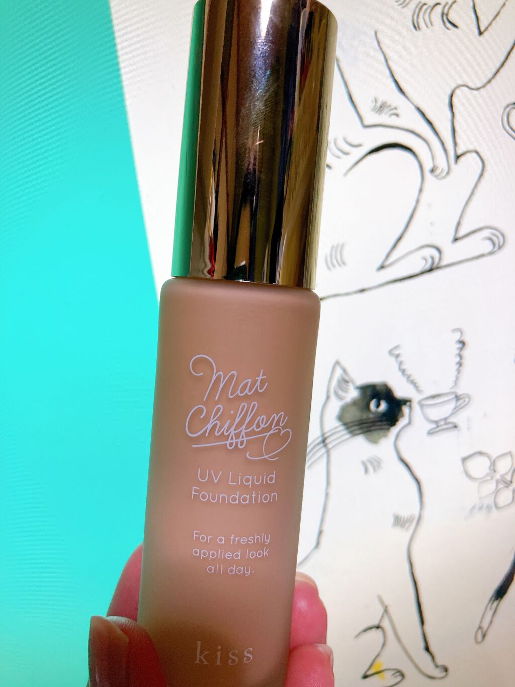 kiss キスマットシフォンUVリキッドファンデ01ライトピンクオークルSPF25/PA++やや重ためなガラスボトルのプッシュタイプ手の甲に出した後傾けても垂れない少し固めのテクスチャ仕上がりはセミマット展開カラーの中では唯一のピンク系だけど...