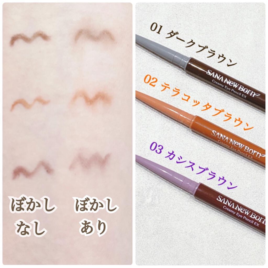 サナニューボーンのクリーミーアイペンシルEXをお試しさせていただきました🌷🤍ペンシルが滑らかで、芯が細いため細かい部分も描きやすかったです!発色もくっきりしていて色ごとに変化を楽しめるようになっています💓ぼかしラインを作れるチップも付いていて...