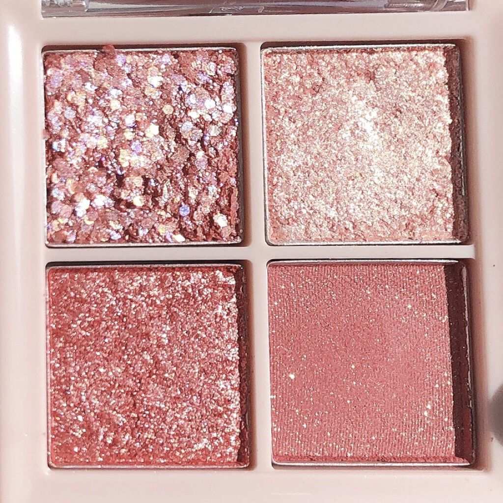 このアイシャドウは4色全部がラメ入りで、普段使いできそうな落ちついたラメやメイクのポイントにぴったりなゴロゴロしたグリッターなど、これ一つで様々なアイメイクができるパレットになってます✊🏻 そして、そのどのラメもめっっっっっちゃきれい!! プチプラだといい意味でナチュラルなラメが多いけど全然輝き方が違う🙄❤︎ 密着度の高いラメが長時間輝き続けてくれます✌️🏻 こんなにきれいなラメがこんなに安く買えるなんて…!! なんて素晴らしい世界なんだ𓆦