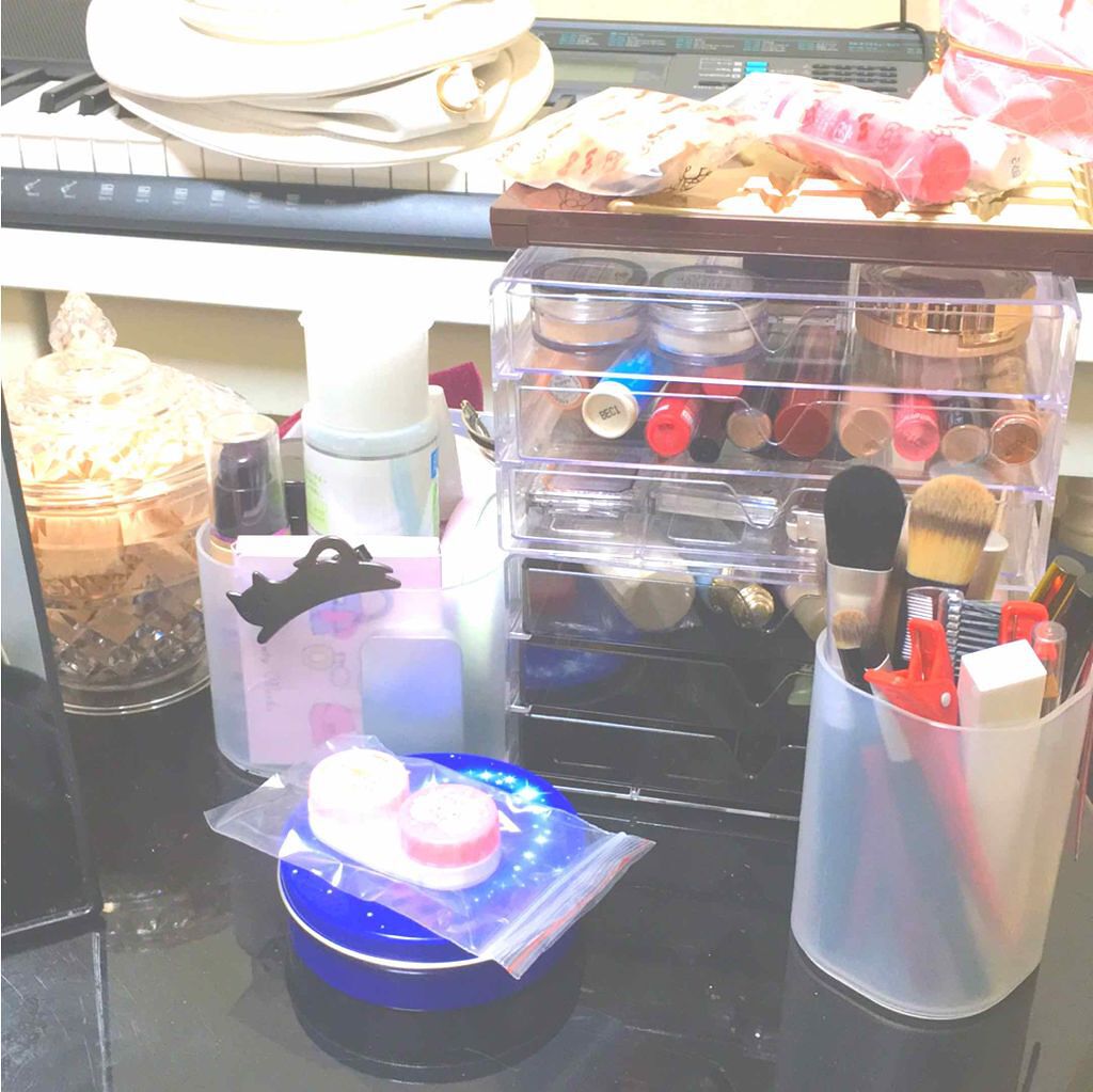 わたしのテリトリーはリビング一角。ダイニングテーブルの片隅のこの部分と木の下にある3段収納(ゴチャゴチャに付き自粛)のみ。 写真にある収納はダイソーの収納×5でできてます! とにかくスペースが足りない!みんなの収納を見習いたい!