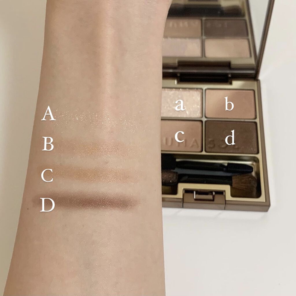 こちらの01 Beige Beigeは、捨て色なしのベーシックなブラウン系シャドウです。 肌にスッと馴染む自然な発色と控えめな上品さで、OLさんに人気なのも納得です! 程よくしっとりしていて、粉飛びもしにくいかなと思います。 B,C…アイホールに全体にぼかすのが良さそうな肌馴染みの良いベージュ A…光が集まりそうな粒大きめの大人ラメ D…目尻やキワの締色にぴったりのブラウン 社会人になって使うのが楽しみなアイシャドウでした〜!