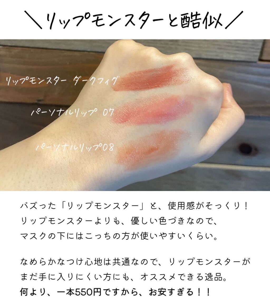 リニューアル前のモデルから、ずっと愛用し続けています。550円のプチプライスなのに、するする伸びるつけ心地は「リップモンスター」そっくり! 下の唇の色が透けるから、自分にぴったりのオリジナルカラーになるのがこのアイテムの特徴です。 特に、新色に色はトレンドを取り入れた、ダスティなピンクと、くすみ感のあるオレンジ。ぜひドラッグストアでチェックしてみてね✨