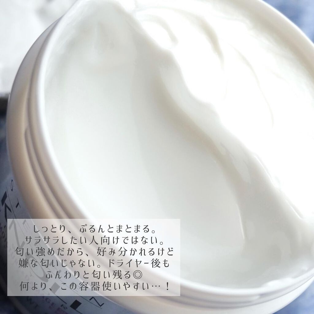 - カラーやパーマなど様々なダメージも髪内部から補修し、うるおいに満ちたまとまりのよいしなやかな髪が持続するヘアマスク。