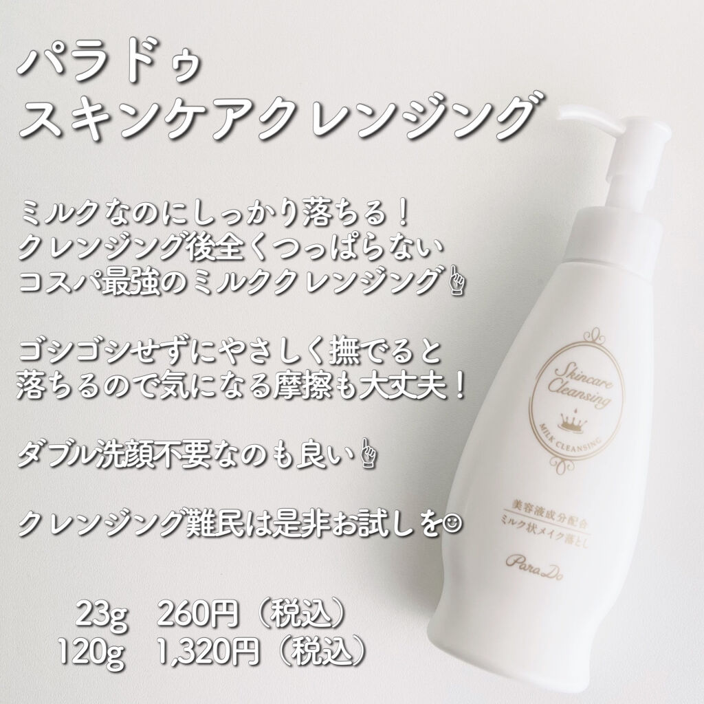 パラドゥ様のプレゼントキャンペーンでスキンケアクレンジングL当選しました🎉ミルク状メイク落としです。メイク落としの種類って沢山あるけど、私はミルクタイプが一番好きです❤肌に優しい感じがする。これスキンケアクレンジングってなってる‼...