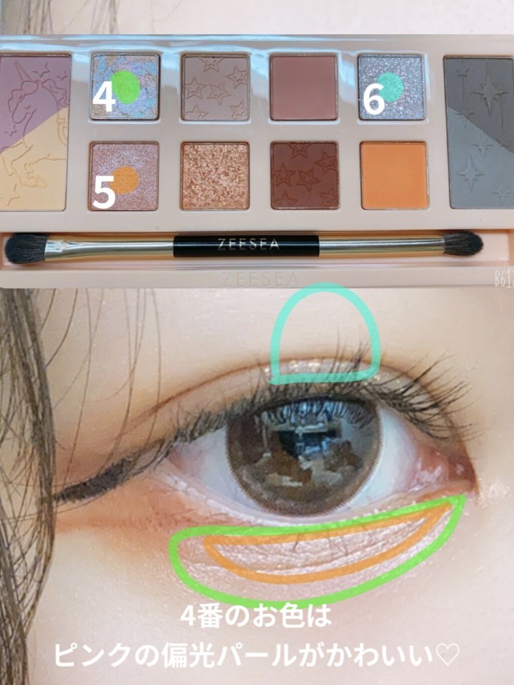 まず、ベースカラーを上まぶた全体に乗せます。 次に、少し薄めのブラウンを二重幅に乗せます。 左下の赤いカラーを涙袋全体に乗せます。 最後に、目尻側の3角ゾーンに一番濃いブラウンを入れたら完成です✨ アイラインは、今回は強めメイクなので垂れさせずに引きます。 地雷盛りラインはいつも通り平行に引くのがポイントです🍀 地雷盛りラインに使っているのは、クリーミータッチライナー05です。 今回のメイクは、初心者さんにも簡単にできるメイクだと思います♡ 時短にもなりますし、ちょっと強めな女になれます。 目頭側から、黒目の終わりあたりまで黄色味の強いラメ感アイシャドウを乗せても可愛いです! ぜひ、お試しください🍀