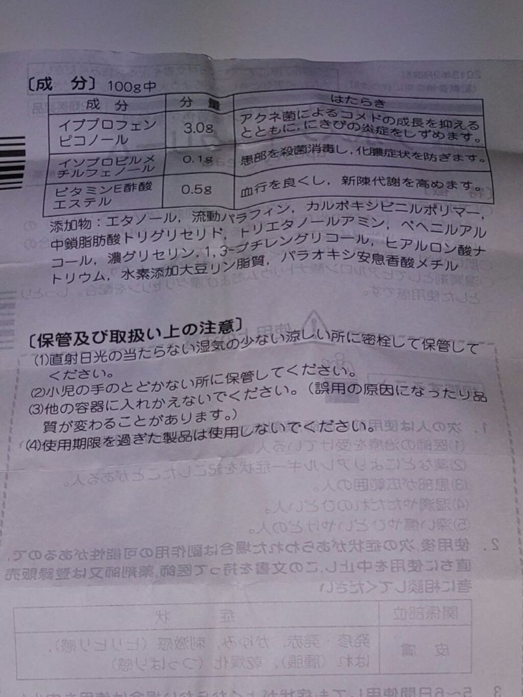 - (100g中) イブプロフェンピコノール・・・・・・・・3.0g イソプロピルメチルフェノール・・・・・・0.1g ビタミンE酢酸エステル・・・・・・・・・0.5g 添加物;エタノール、流動パラフィン、カルボキシビニルポリマー、中鎖脂肪酸トリグリセリド、トリエタノールアミン、ベヘルニアルコール、濃グリセリン、1,3-ブチレングリコール、ヒアルロン酸ナトリウム、水素添加大豆リン脂質及びパラオキシ安息香酸メチル