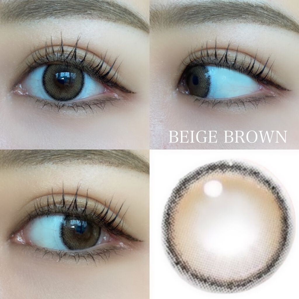 ヌードブラウンベージュよりもくすみ感があってグレーっぽい! ベージュブラウン王道のベージュカラー!初めての方には1番挑戦しやすい色! 「うるみ」が増してよりナチュラルに😆UVカット・新素材シリコンポリマーレンズで着け心地も快適だよ💓 付けるとちゅるんとした色素うす〜〜い系の瞳になれるから本当にオススメ🥺💓
