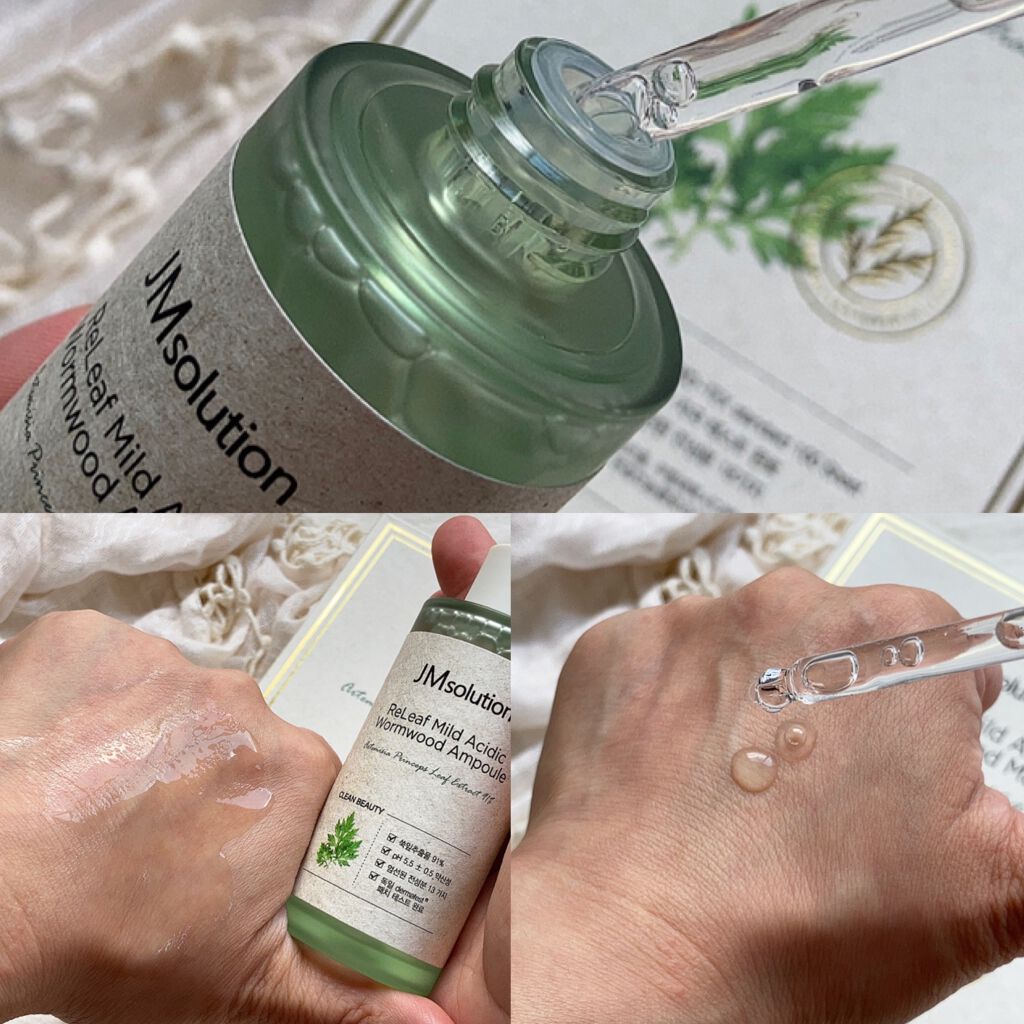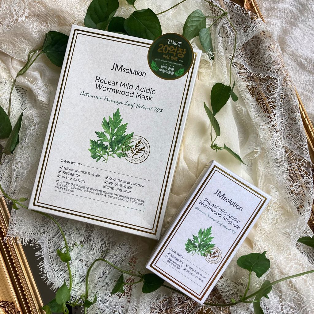 ヨモギエキスがたっぷり含まれているスキンケアです。 ヨモギ葉エキス91%配合されたアンプル。 ゆるめのジェルでみずみずしさ抜群! 肌にすんなりなじむ付け心地がたまりません。 肌にうるおいをあたえてくれて、整えてくれました。 ヨモギ葉エキス70%配合されているシートマスク 生地がすっごくやわかくて、そこに美容液がたっぷり含まれているのがたまりません。 香りはやすらぐハーブの香りがして、パック時間はゆったりタイムでリラックスできました。