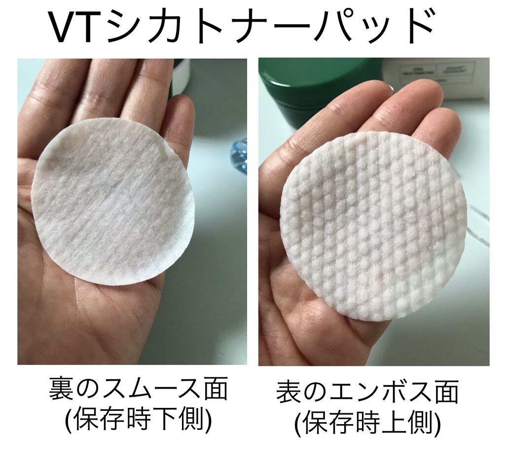 でこぼこのエンボス面で不必要な角質や毛穴汚れなどを拭き取れるトナーパッド! 朝ぬるま湯で顔を洗ってから、メイク前にトナーパットで拭き取るのが大好き🌟 夜のケアだと、赤みやポツポツニキビが気になる部分にパットを抑えて部分用パックとして使うのも好き!! VTのCICAはとにかく肌荒れが気になる時 (赤みやニキビ)に使用するのがおすすめ🌿💚