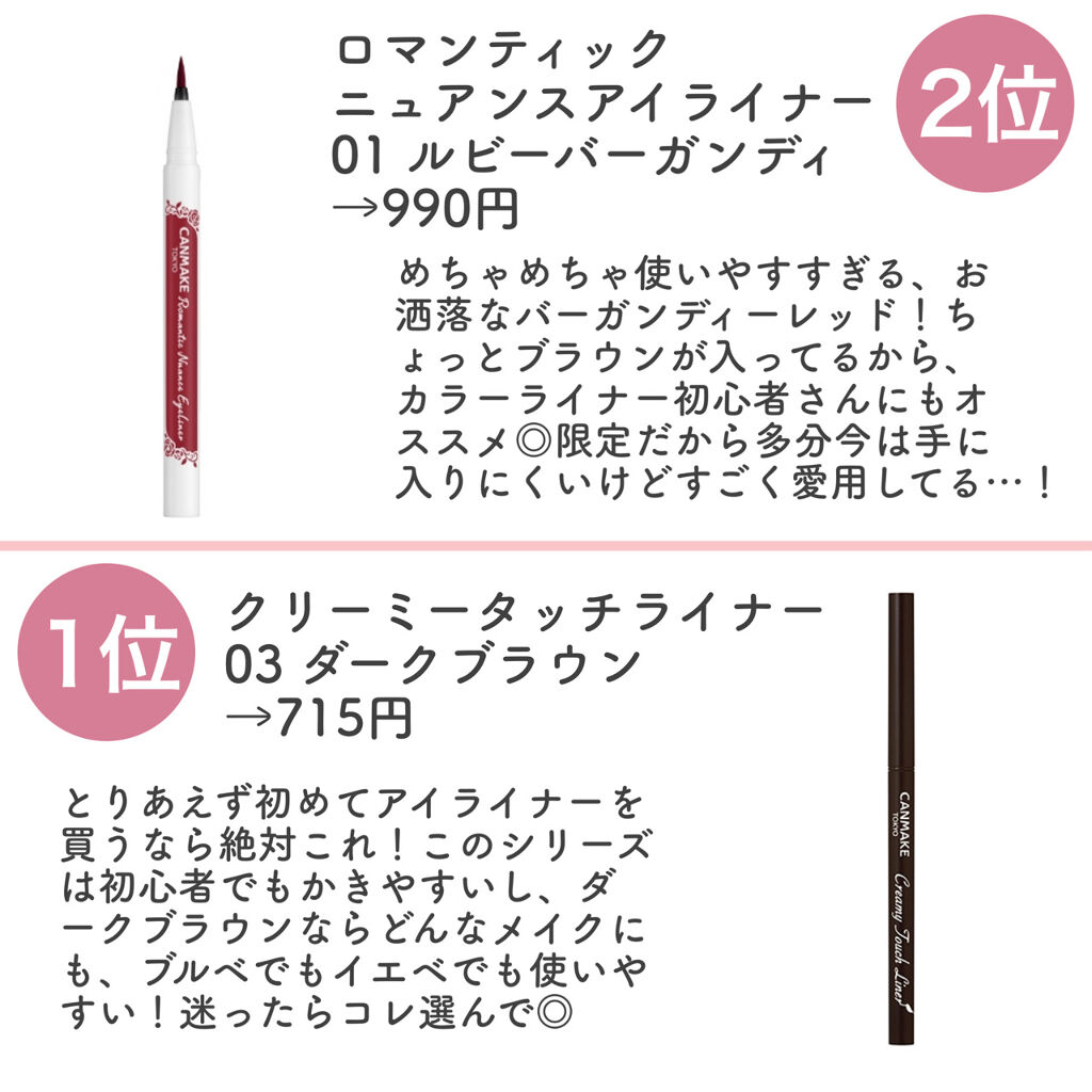 キャンメイククリーミータッチライナー03ダークブラウン¥715(税込)大バズりクリーミータッチライナー今になって買ってみたけど、もっと早く買えばよかったって思います😭💓💓💓この値段で良いの?ってくらい使いやすかった!カラーはダークブラウンで暗...