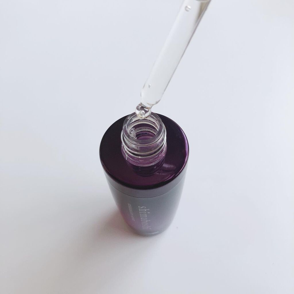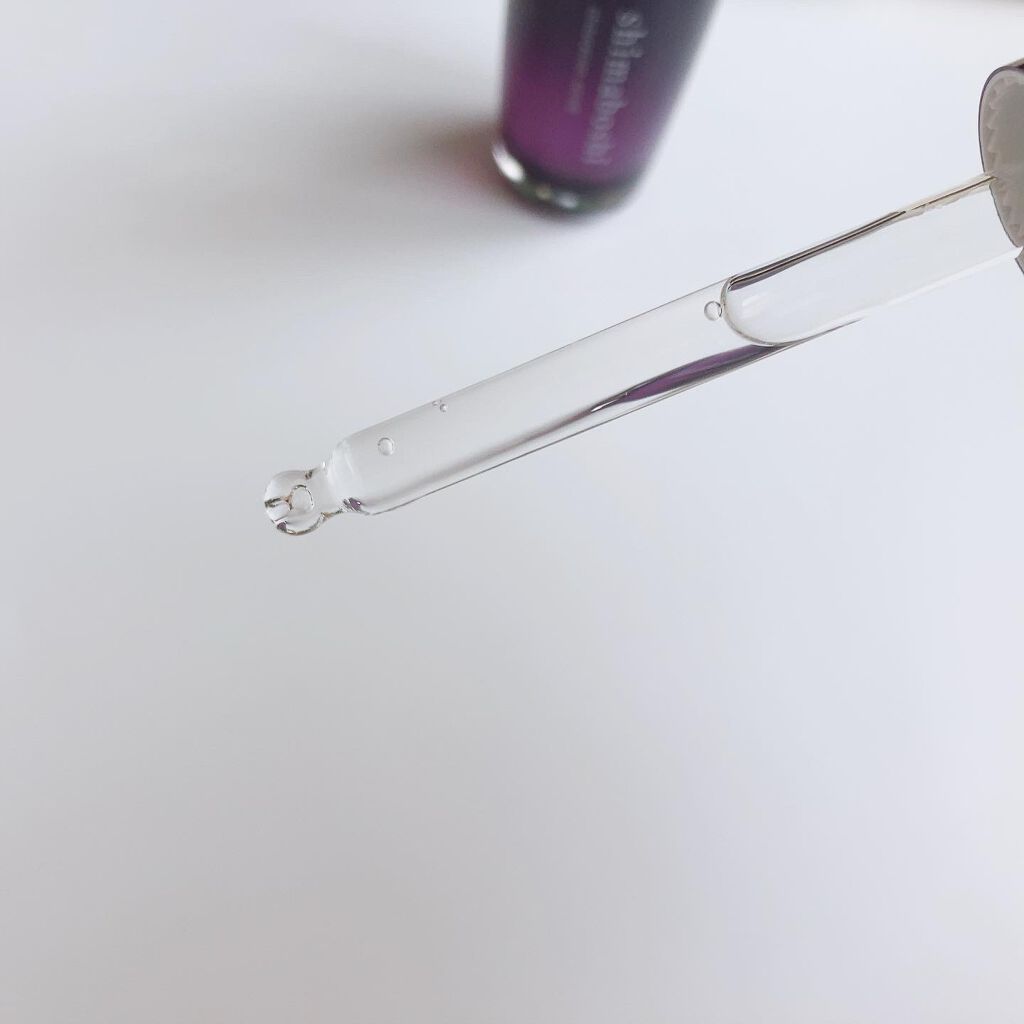 浸透力にこだわり、リポソーム化した、ヒト由来の幹細胞培養エキスを配合! ヒト脂肪細胞順化培養液というのは、健康的なヒトの脂肪から採取した脂肪由来の細胞を培養した培養液なのですが、様々な美容成分が含まれているのだそう。 更に、角質層まで浸透しやすくするために、リポソーム化! 他にもAPPS 浸透型ビタミンC誘導体や、セラミド1,3,6、機能性ペプチドを配合しています。 水のようにサラサラなテクスチャーで、手の甲に1滴落とすと、ツーッと流れてくるほど緩やか。 スポイトが固めで、しっかり取れているか心配になる方もいるかもしれませんが スポイト1吸いでだいたい2cmほど。 手の平に出した時、1円玉大位になります。 べたつきや香りなどもなく、使いやすいですよ。 そして、シマボシのシリーズはボトルが本当にキレイ。 紫のような青のようなカラーに惚れ惚れします。