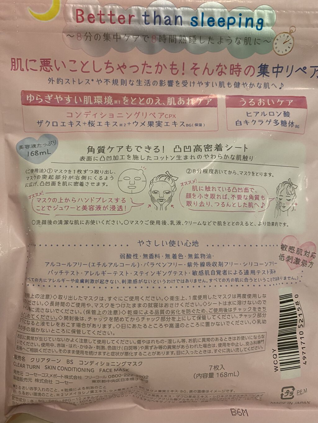 - 【クリアターン ごめんね素肌マスク】 負担をかけて、あれてしまった肌の素肌環境※1をととのえる“速攻集中リペア※2マスク”です。 ① あれがちな肌を素早くコンディションケア! ザクロエキス、桜エキス※3、ウメ果実エキスBG配合し、ゆらぎやすい肌環境をととのえ、肌あれをケアします。また、うるおいケア成分として、ヒアルロン酸、白キクラゲ多糖体BGを配合。外的ストレス※4や不規則な生活の影響を受けやすい肌も健やかでゆらぎにくい肌へみちびきます。 ②敏感肌も使える、弱酸性・低刺激処方 無香料・無着色・無鉱物油・アルコールフリー(エチルアルコール)・パラベンフリー・紫外線吸収剤フリー・シリコーンフリー・パッチテスト済み・アレルギーテスト済み・スティンギングテスト済み・敏感肌自覚者による連用テスト済み(すべての方にアレルギーや皮膚刺激が起きない、刺激感がないというわけではありません。すべての方の肌に合うということではありません。) ③角質ケアもできる!凸凹高密着シート コットン生まれのやわらかな肌触りのベンリーゼを使用。 表面に凸凹のエンボス加工を施しているため、密着性が高く、はがしたマスクでやさしく顔をふきとることで角質ケアもできます。 ※1 うるおい環境のこと ※2 うるおいお手入れのこと ※3 ソメイヨシノ葉エキス、ウメ果実エキスBGはウメ果実エキス・BG(保湿) ※4 乾燥による刺激のこと