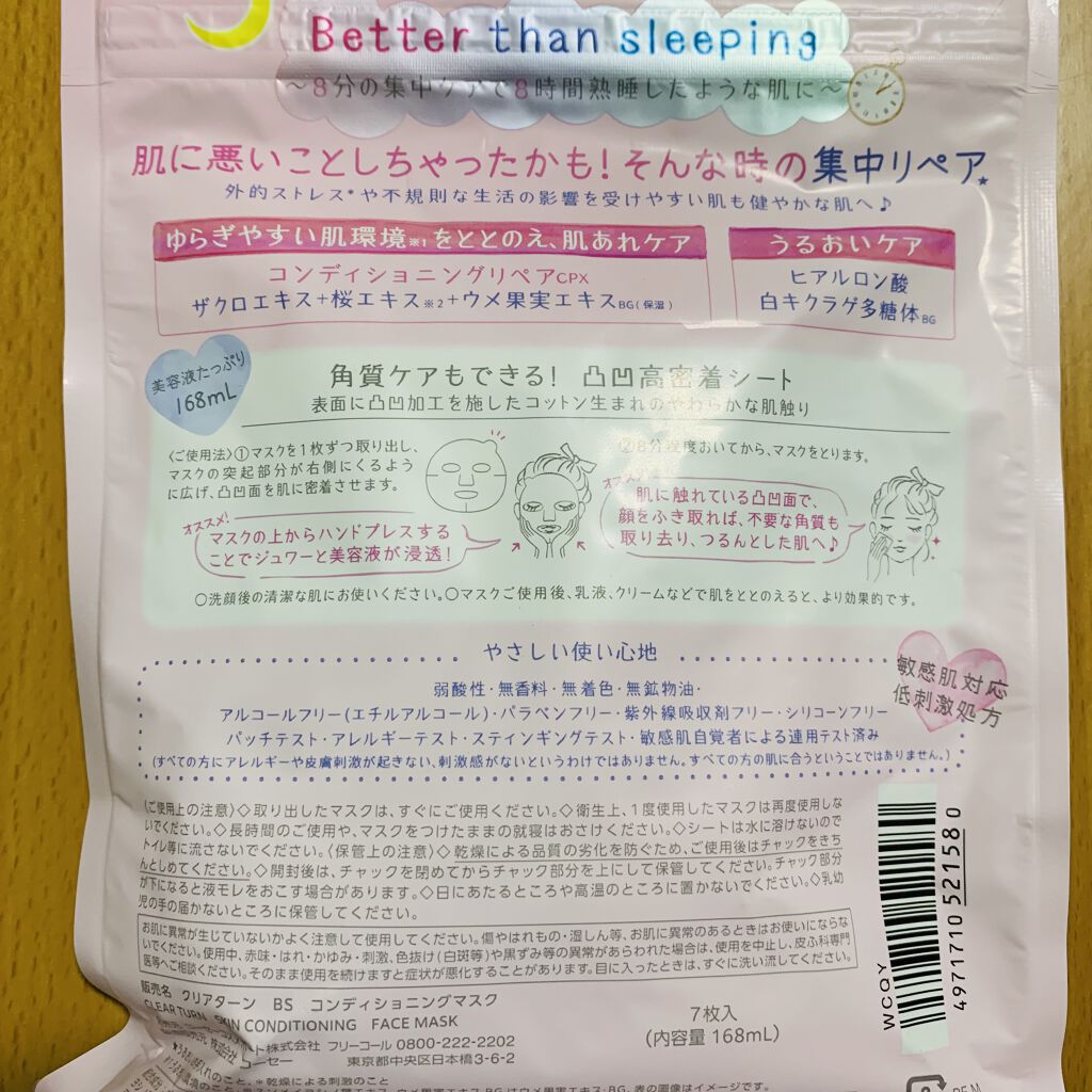 - 【クリアターン ごめんね素肌マスク】 負担をかけて、あれてしまった肌の素肌環境※1をととのえる“速攻集中リペア※2マスク”です。 ① あれがちな肌を素早くコンディションケア! ザクロエキス、桜エキス※3、ウメ果実エキスBG配合し、ゆらぎやすい肌環境をととのえ、肌あれをケアします。また、うるおいケア成分として、ヒアルロン酸、白キクラゲ多糖体BGを配合。外的ストレス※4や不規則な生活の影響を受けやすい肌も健やかでゆらぎにくい肌へみちびきます。 ②敏感肌も使える、弱酸性・低刺激処方 無香料・無着色・無鉱物油・アルコールフリー(エチルアルコール)・パラベンフリー・紫外線吸収剤フリー・シリコーンフリー・パッチテスト済み・アレルギーテスト済み・スティンギングテスト済み・敏感肌自覚者による連用テスト済み(すべての方にアレルギーや皮膚刺激が起きない、刺激感がないというわけではありません。すべての方の肌に合うということではありません。) ③角質ケアもできる!凸凹高密着シート コットン生まれのやわらかな肌触りのベンリーゼを使用。 表面に凸凹のエンボス加工を施しているため、密着性が高く、はがしたマスクでやさしく顔をふきとることで角質ケアもできます。 ※1 うるおい環境のこと ※2 うるおいお手入れのこと ※3 ソメイヨシノ葉エキス、ウメ果実エキスBGはウメ果実エキス・BG(保湿) ※4 乾燥による刺激のこと